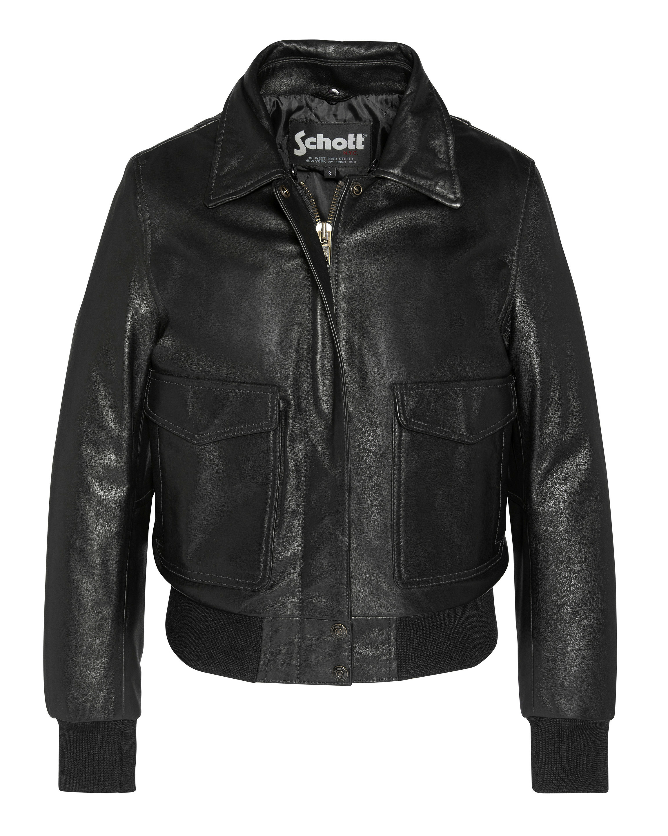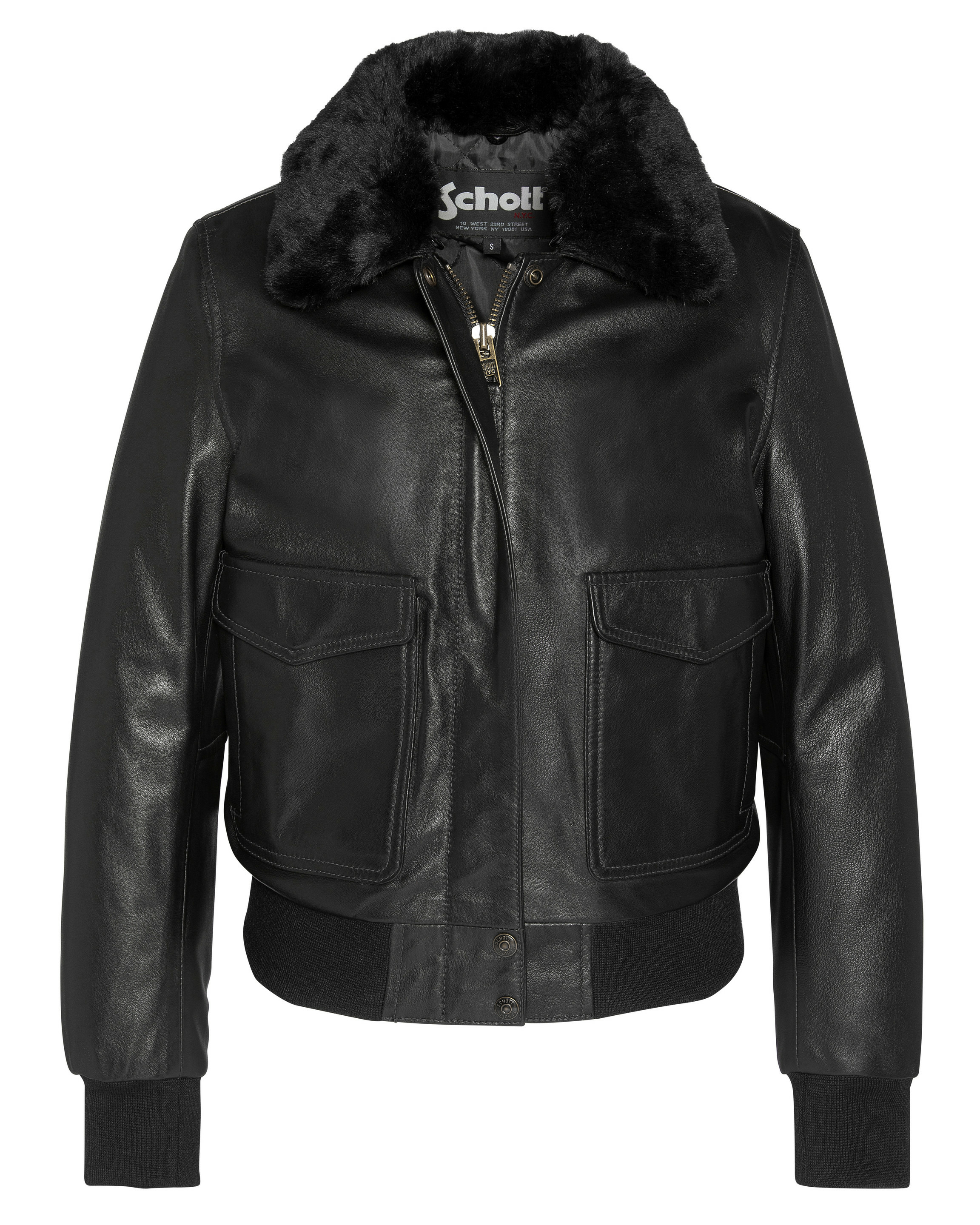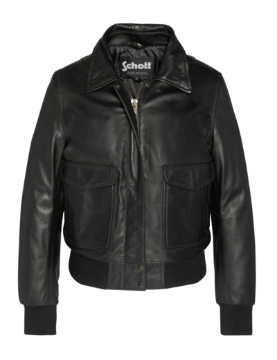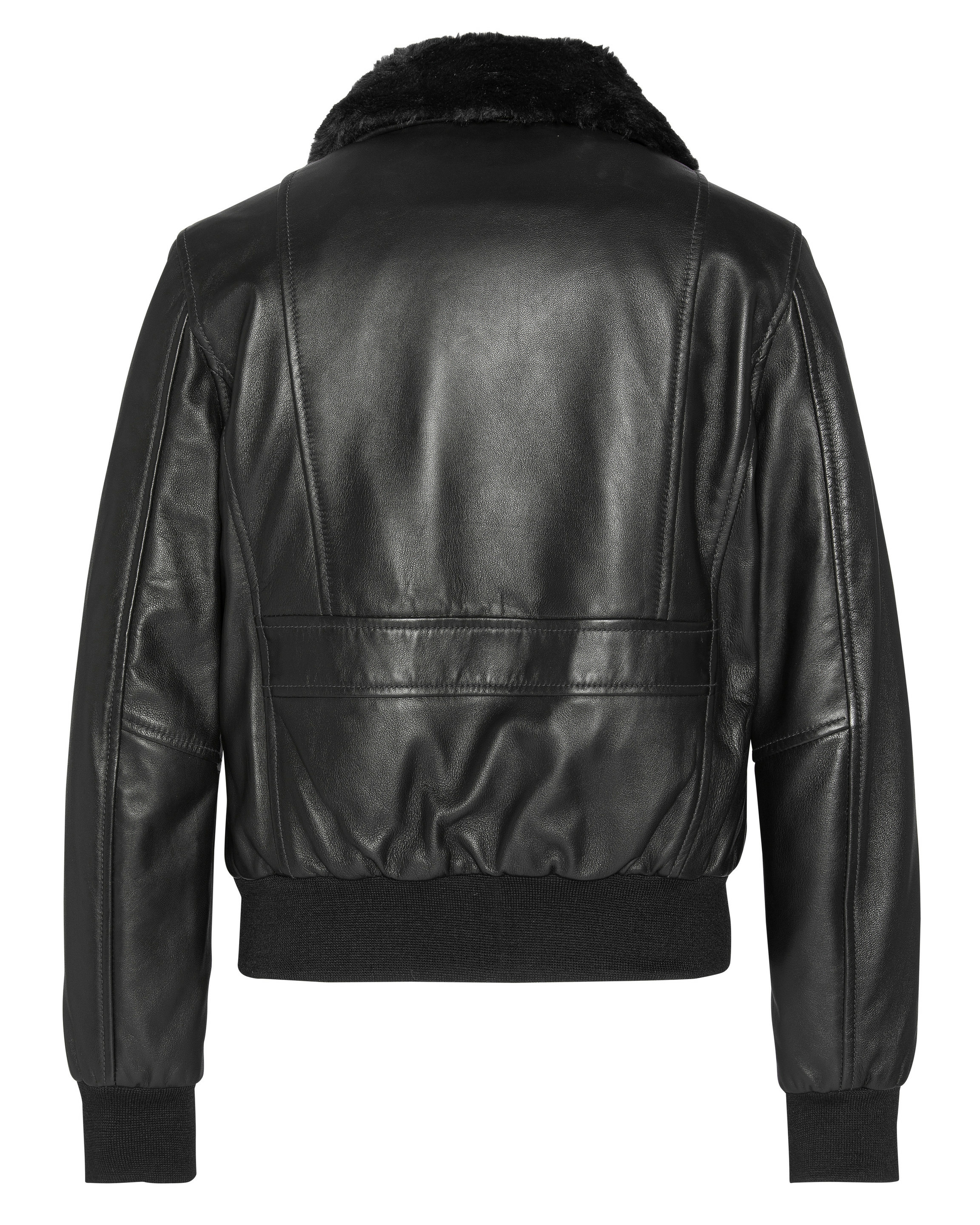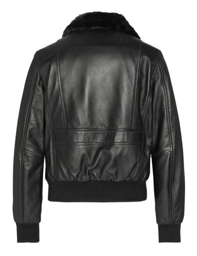 Cuir d’agneau (lambskin) de haute qualité, col en fausse fourrure amovible, fermeture zippée avec rabat pressionné, 2 poches basses à rabat pressionné, 2 poches latérales, finition bord côte aux poignets et à la taille, doublure matelassée, coupe ajustée. Nettoyage par un spécialiste cuir uniquement.