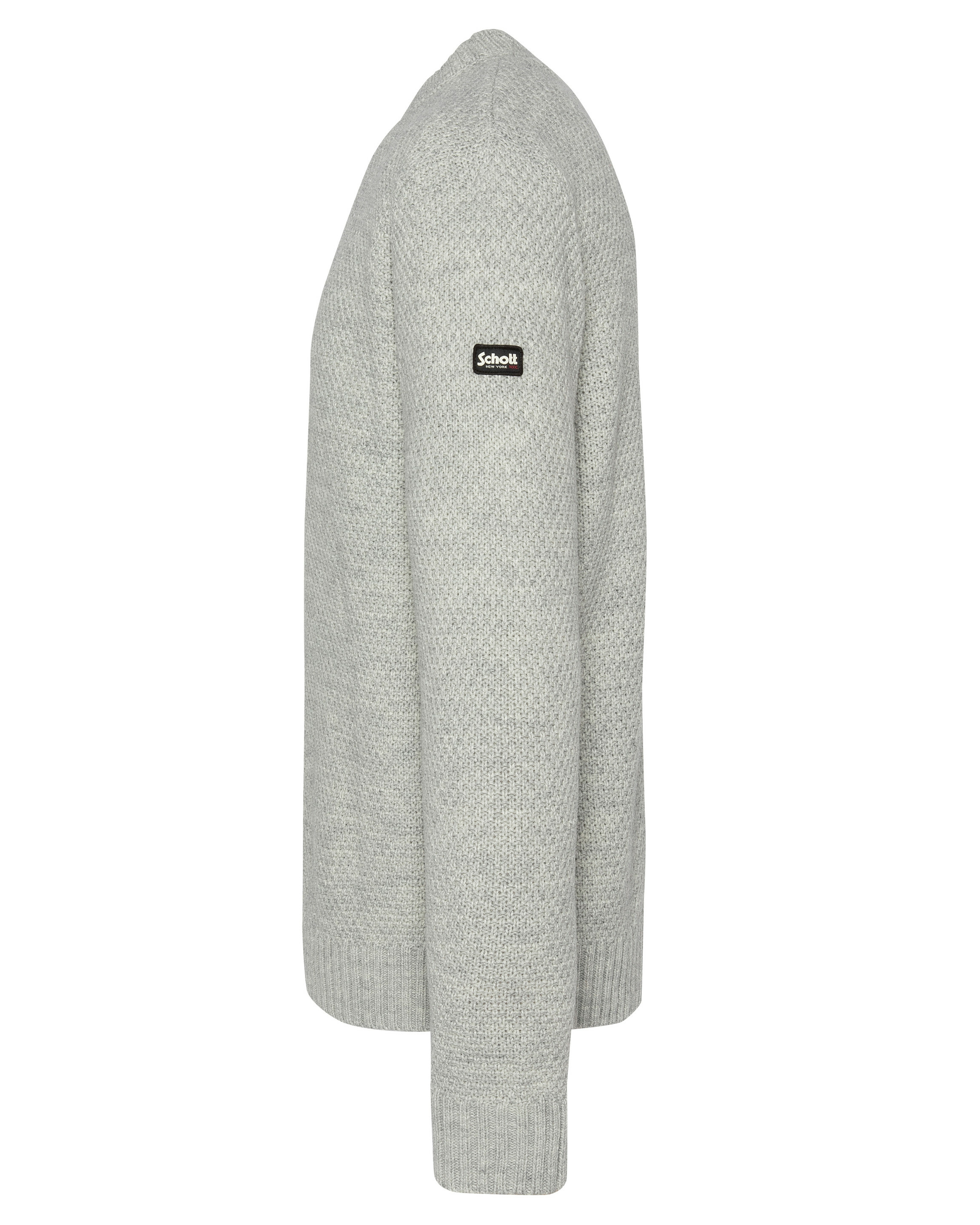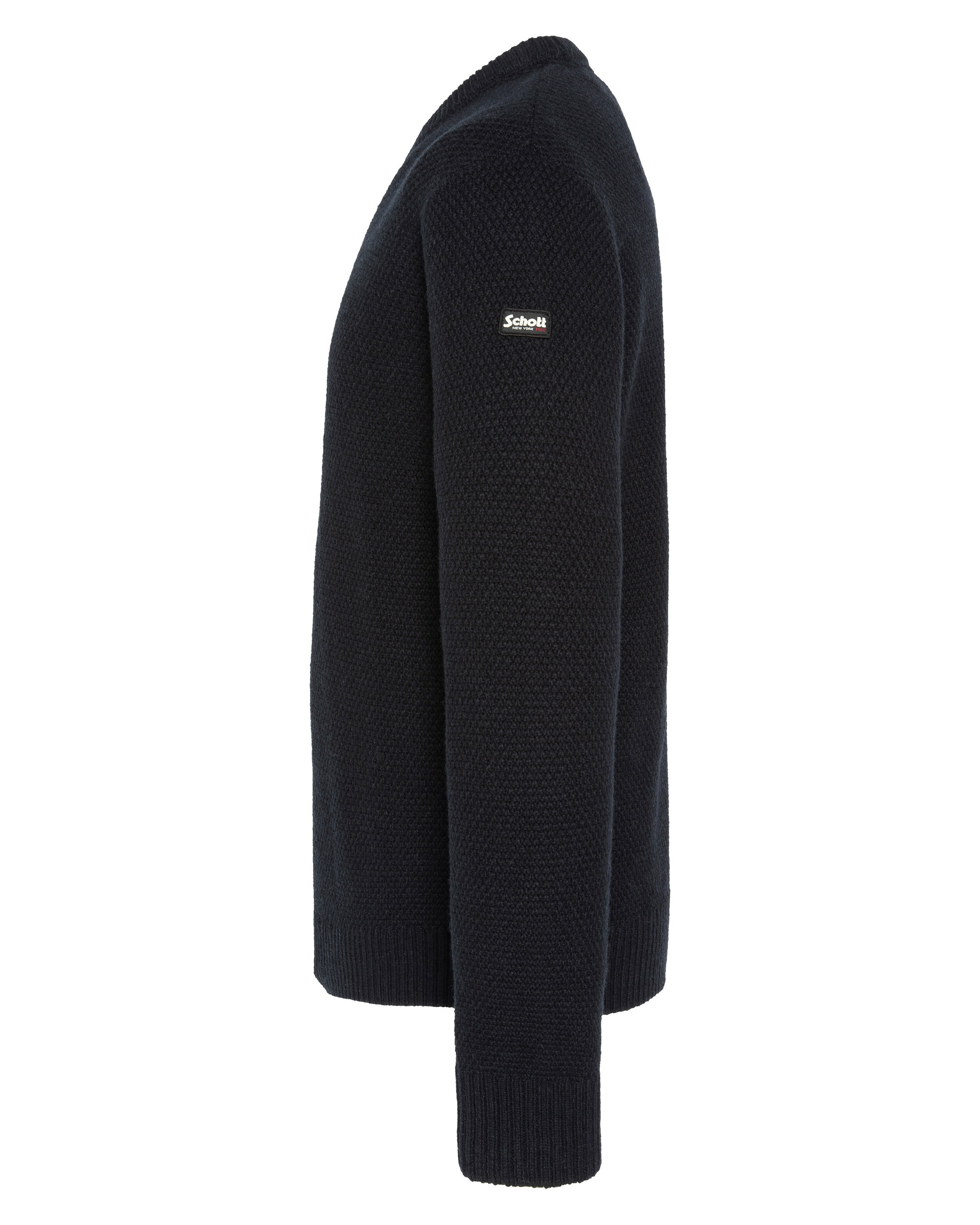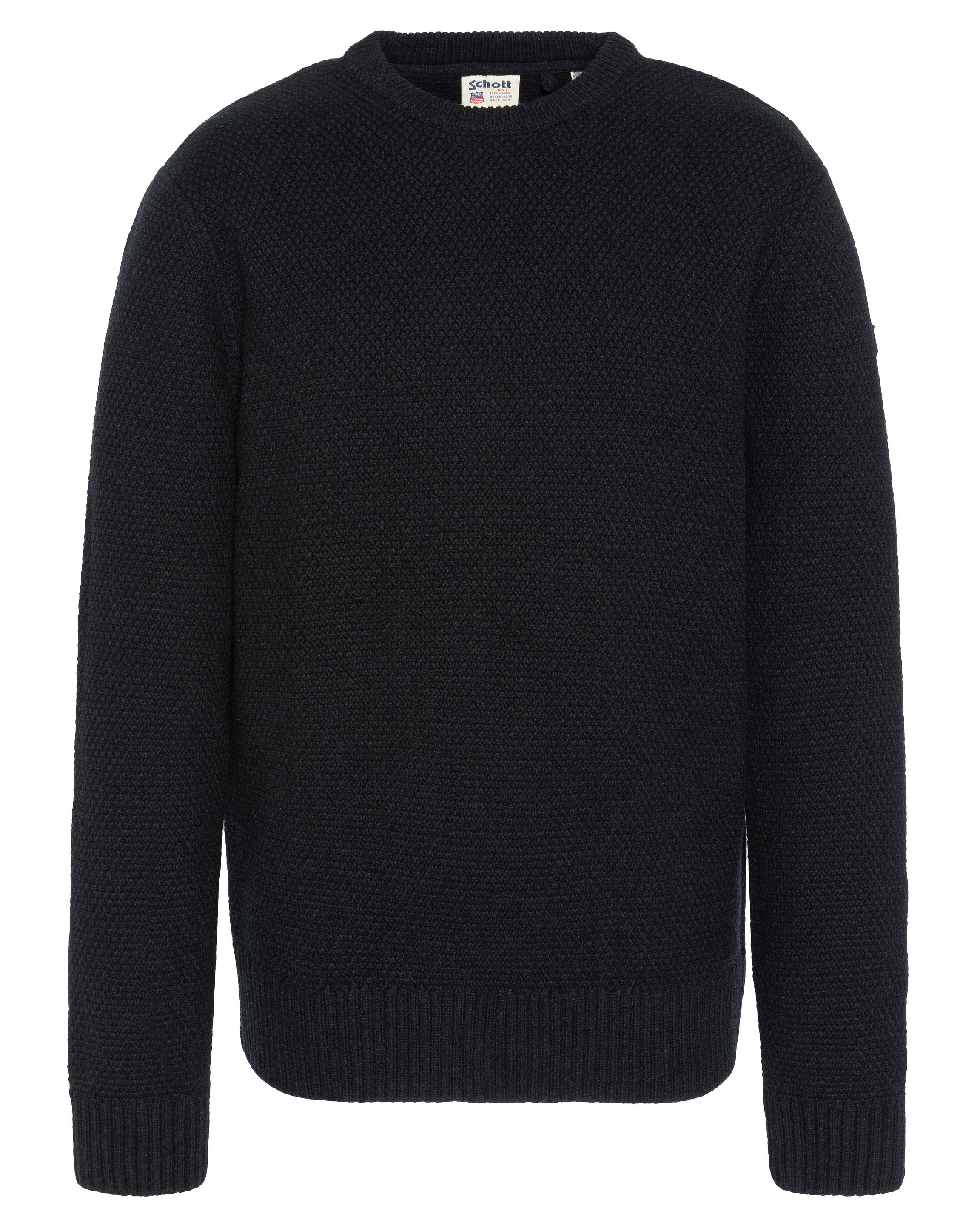 Maille fantaisie, col rond, finitions bord côte au col, poignets et taille, badge logo Schott NYC® sur la manche gauche. Composition : 85% acrylique, 15% laine. Entretien : lavage à 30° en cycle délicat ou laine, lavage séparé, pas de blanchiment, pas de sèche-linge, séchage à plat, repassage doux, pas de nettoyage à sec.