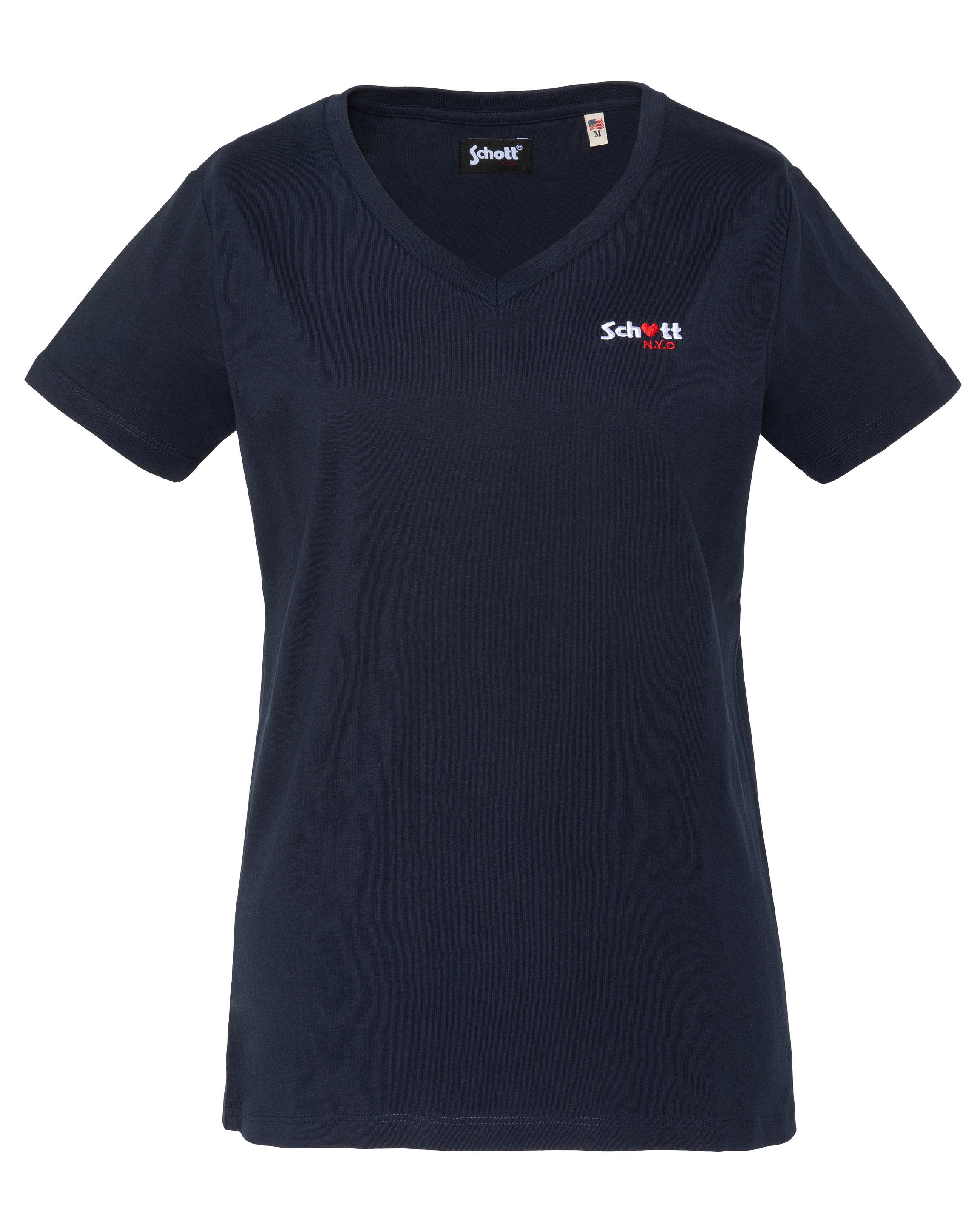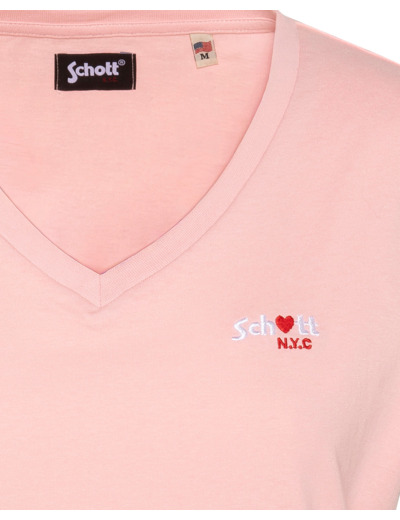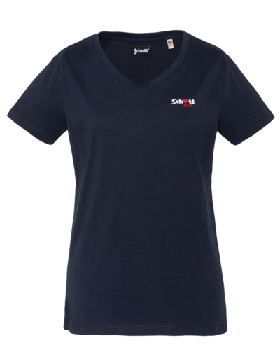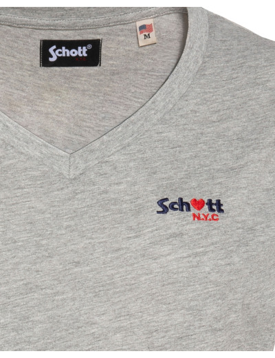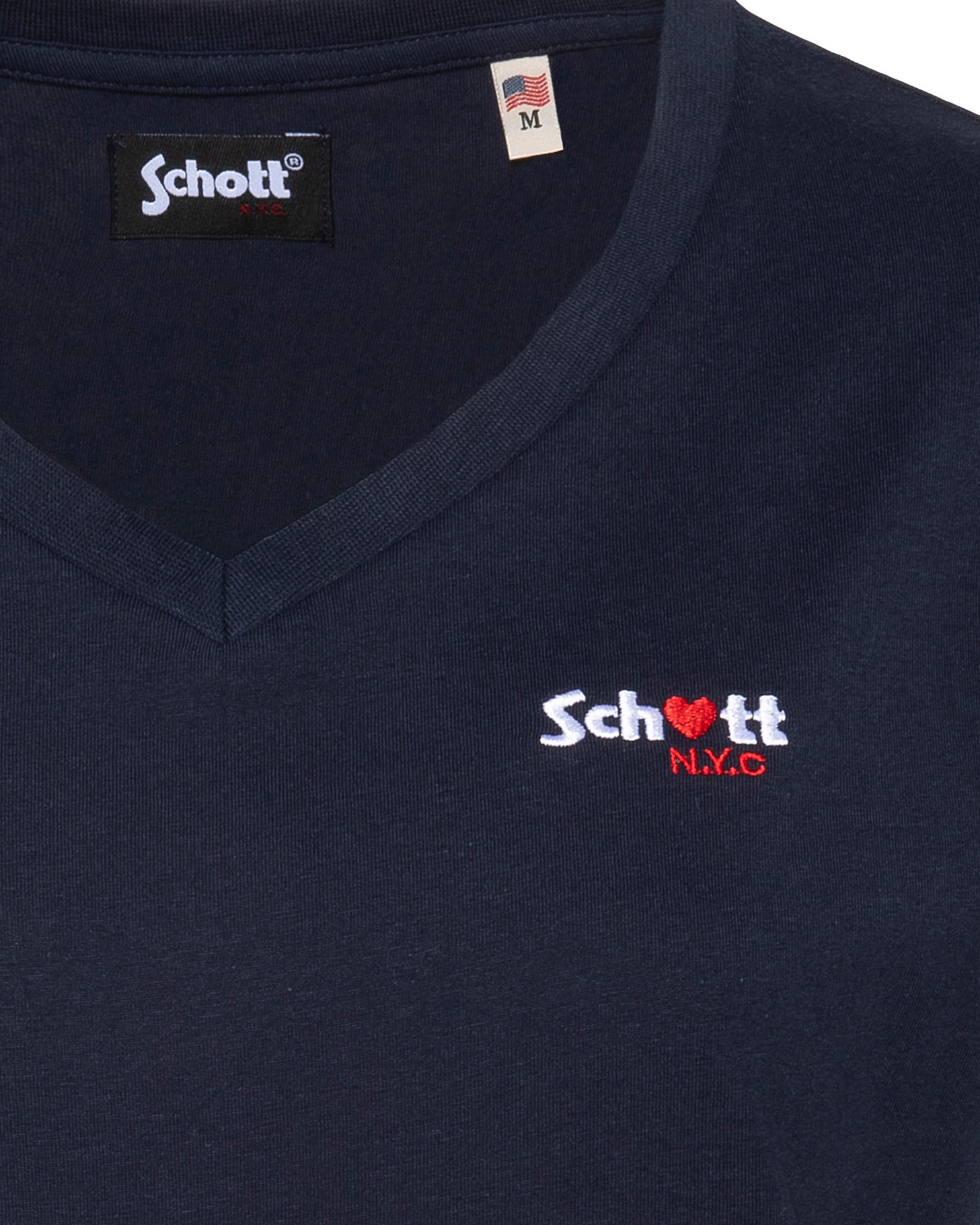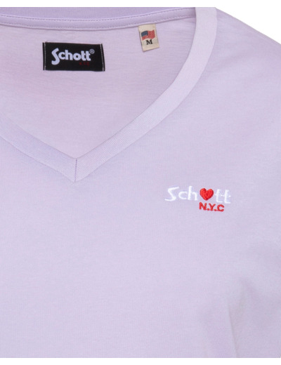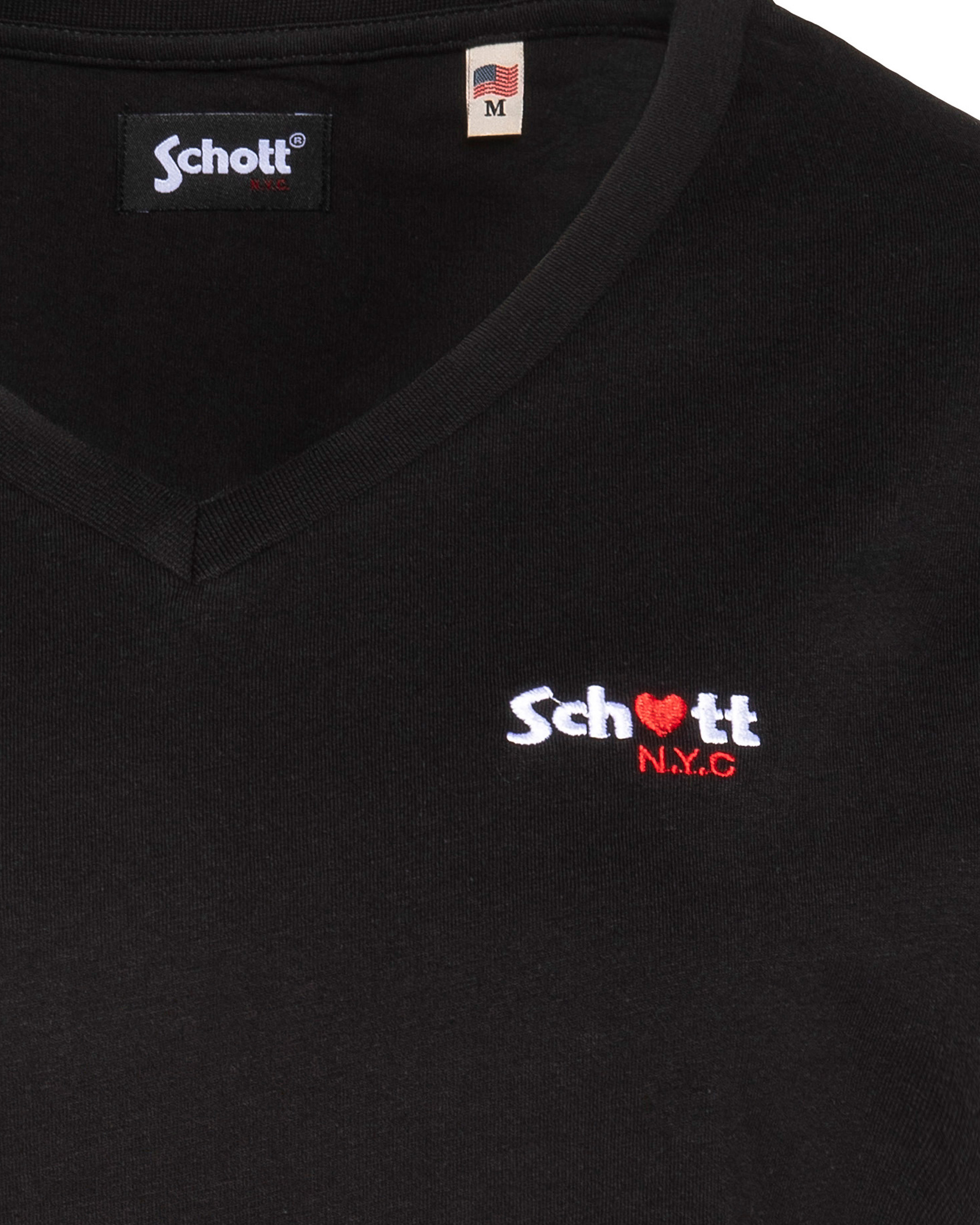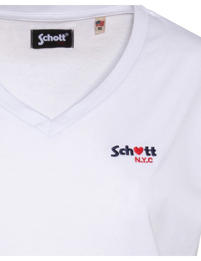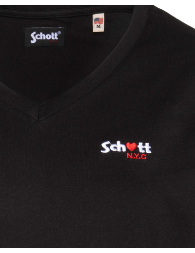 100% coton, col en V, manches courtes, coupe standard. Broderie poitrine « Schott N.Y.C. » avec petit cœur rouge. Entretien : lavage à 30°, pas de blanchiment, pas de sèche-linge, repassage doux, pas de nettoyage à sec, lavage séparé à l’envers.