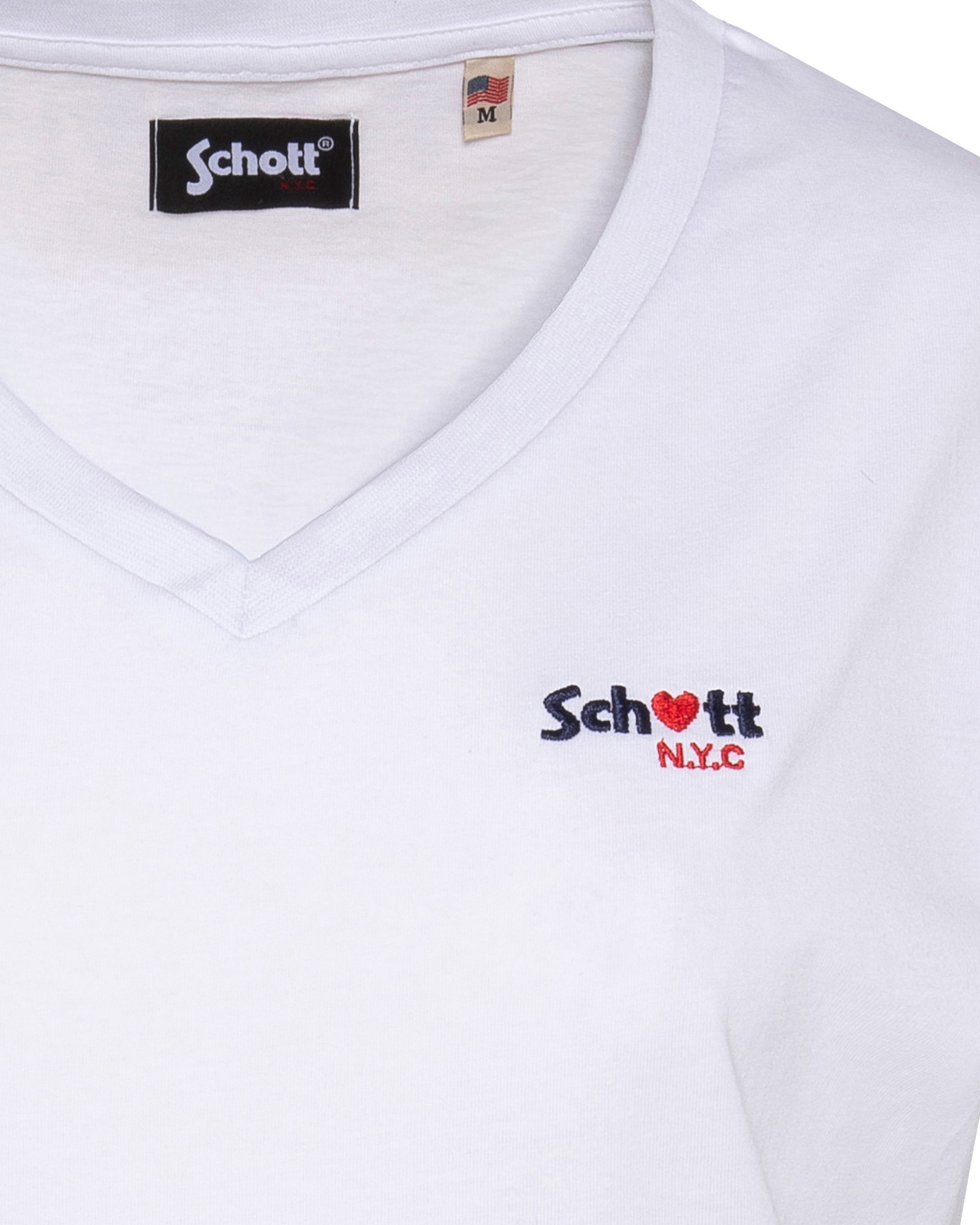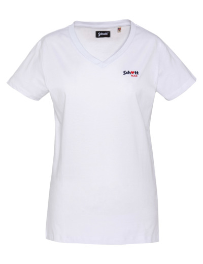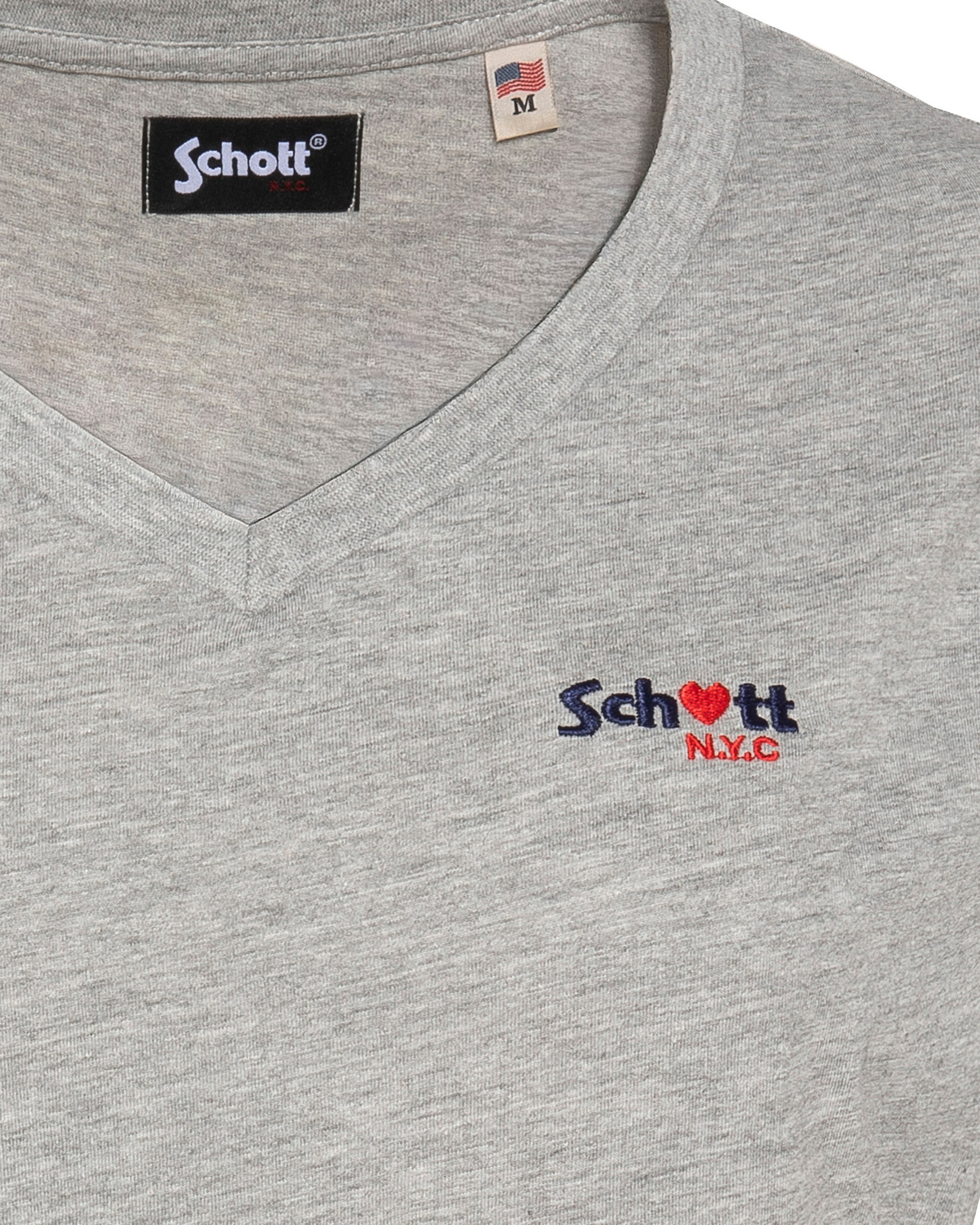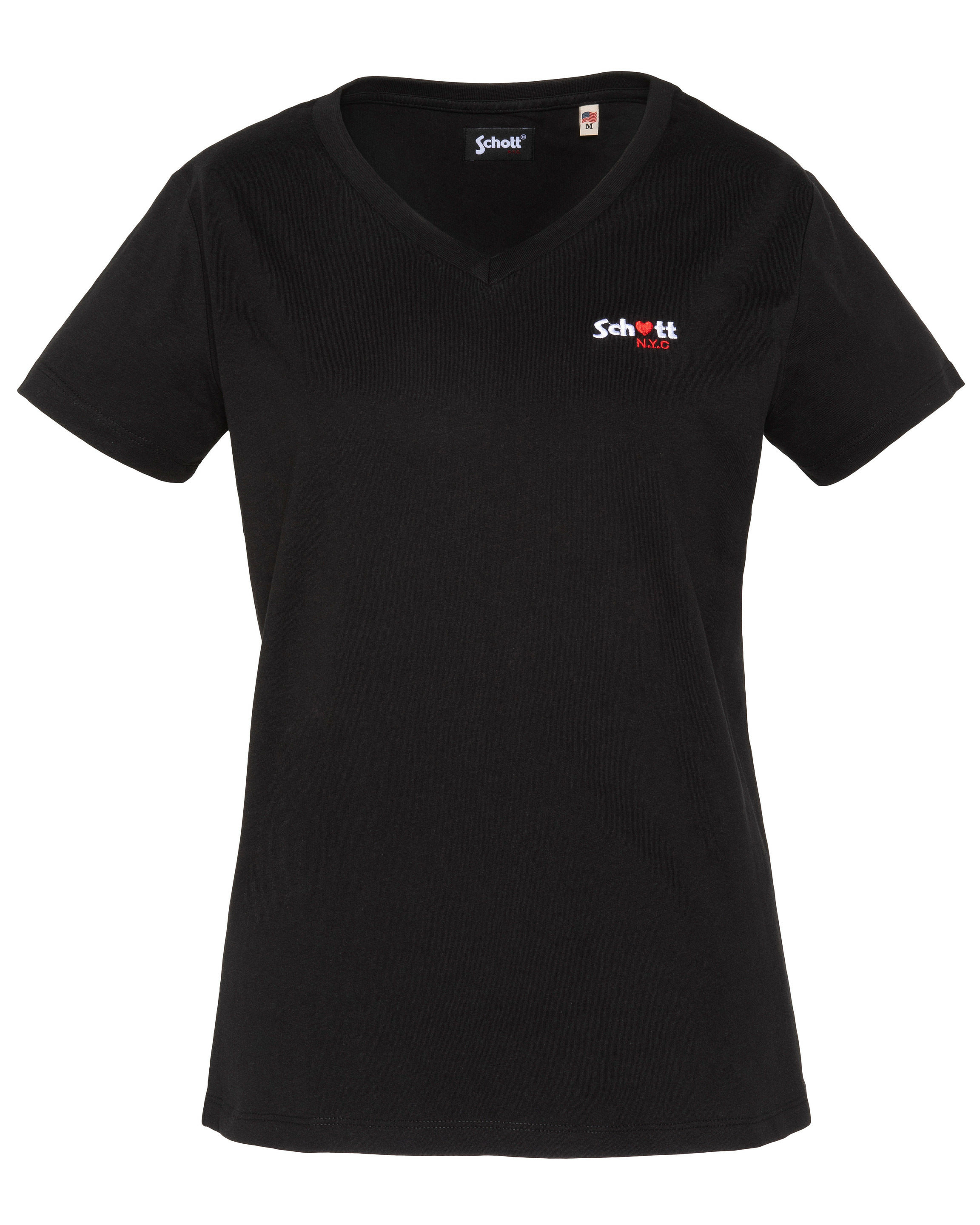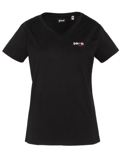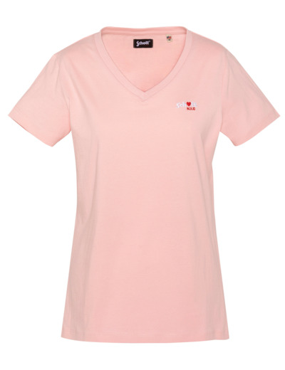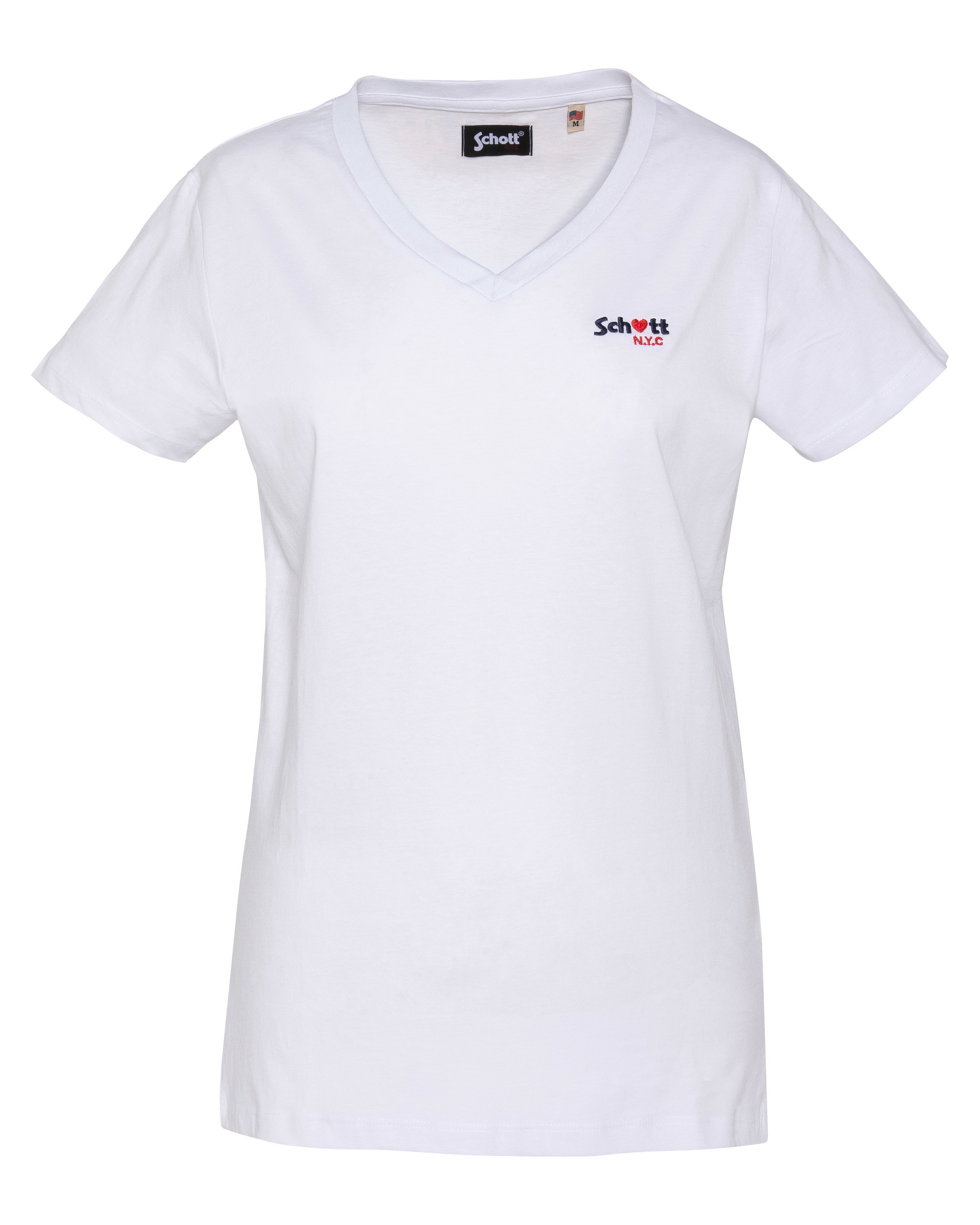 100% coton, col en V, manches courtes, coupe standard. Broderie poitrine « Schott N.Y.C. » avec petit cœur rouge. Entretien : lavage à 30°, pas de blanchiment, pas de sèche-linge, repassage doux, pas de nettoyage à sec, lavage séparé à l’envers.