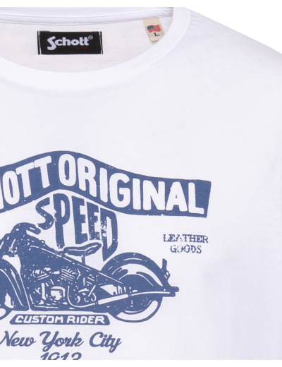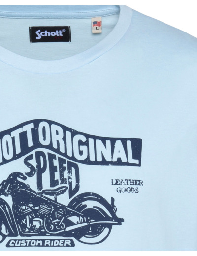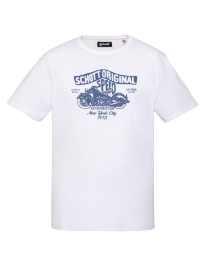 Conçu pour ceux qui aiment afficher leur passion avec subtilité, ce T-shirt arbore un imprimé poitrine « Schott Original Speed » mettant en scène une moto vintage, symbole d’aventure et d’élégance décontractée. Sa coupe standard et son col rond offrent une silhouette équilibrée, facile à porter en toutes occasions, du city look au weekend détente.