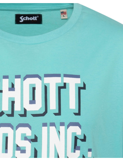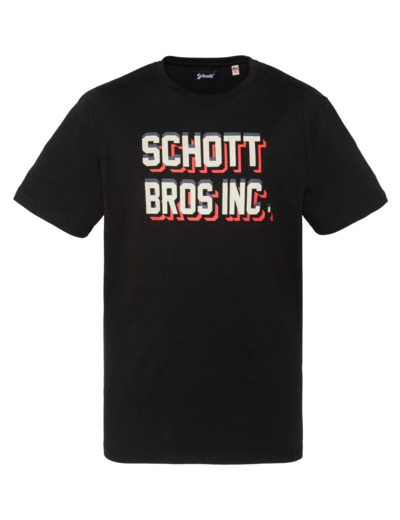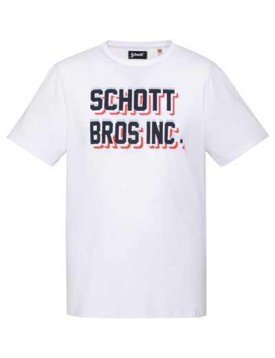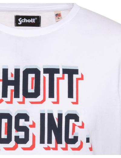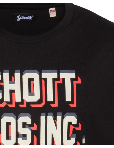 100 % coton, col rond, manches courtes, coupe standard. Grand imprimé « SCHOTT BROS INC. » sur la poitrine. Entretien : lavage à 30°, pas de blanchiment, pas de sèche-linge, repassage doux à l’envers, pas de nettoyage à sec.