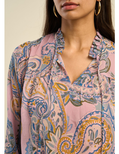 Laissez-vous envoûter par notre blouse TALOUIZA, un top imprimé au motif cachemire, richement travaillé pour un effet élégant et raffiné. Confectionnée dans une matière fluide et agréable, cette blouse se distingue par son col tunisien orné de liens délicats et son joli détail volant qui apporte une touche de légèreté. Les manches longues, légèrement amples et resserrées aux poignets, ajoutent une dimension chic et moderne à ce modèle. Une pièce parfaite pour allier confort et féminité au quotidien.