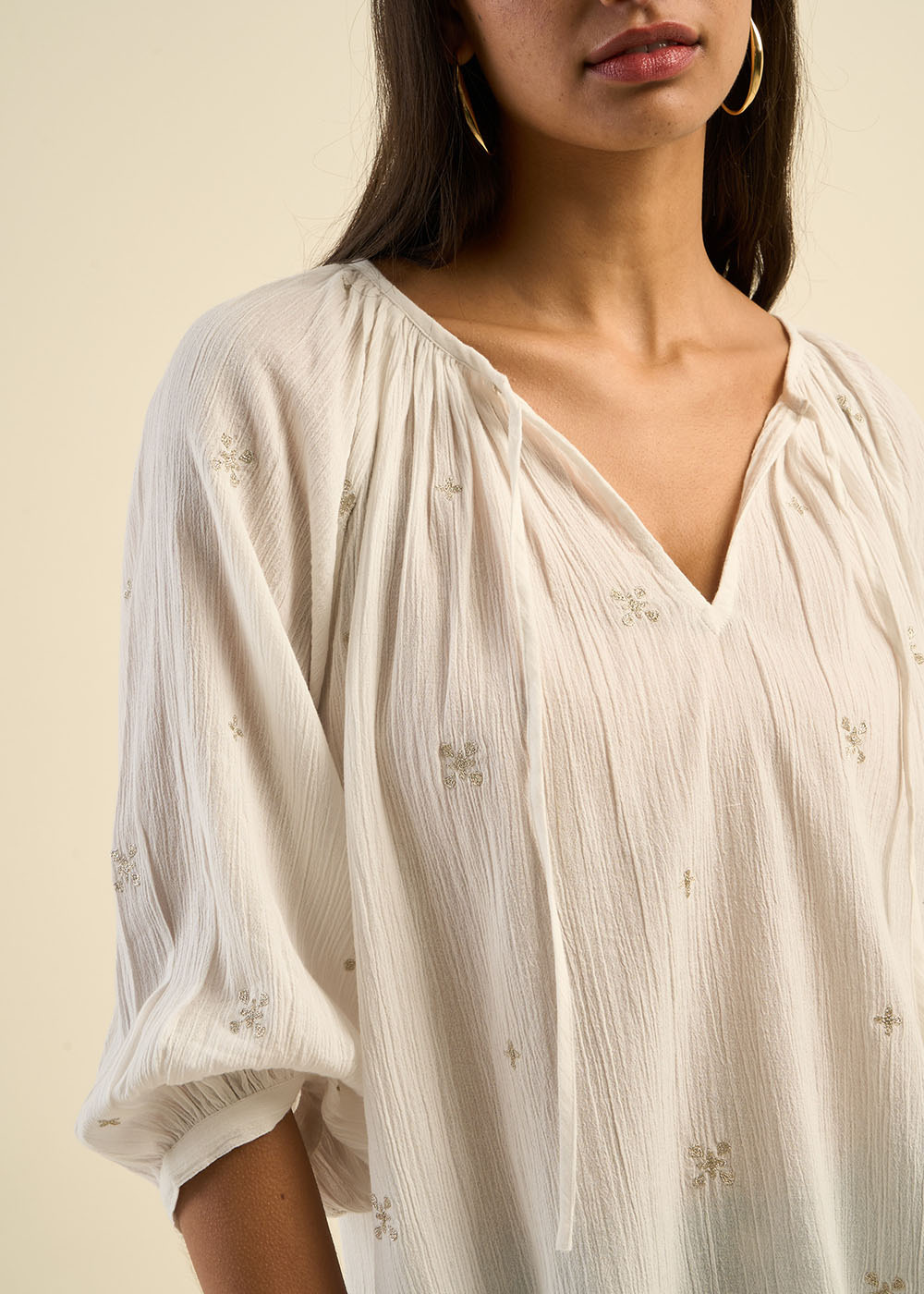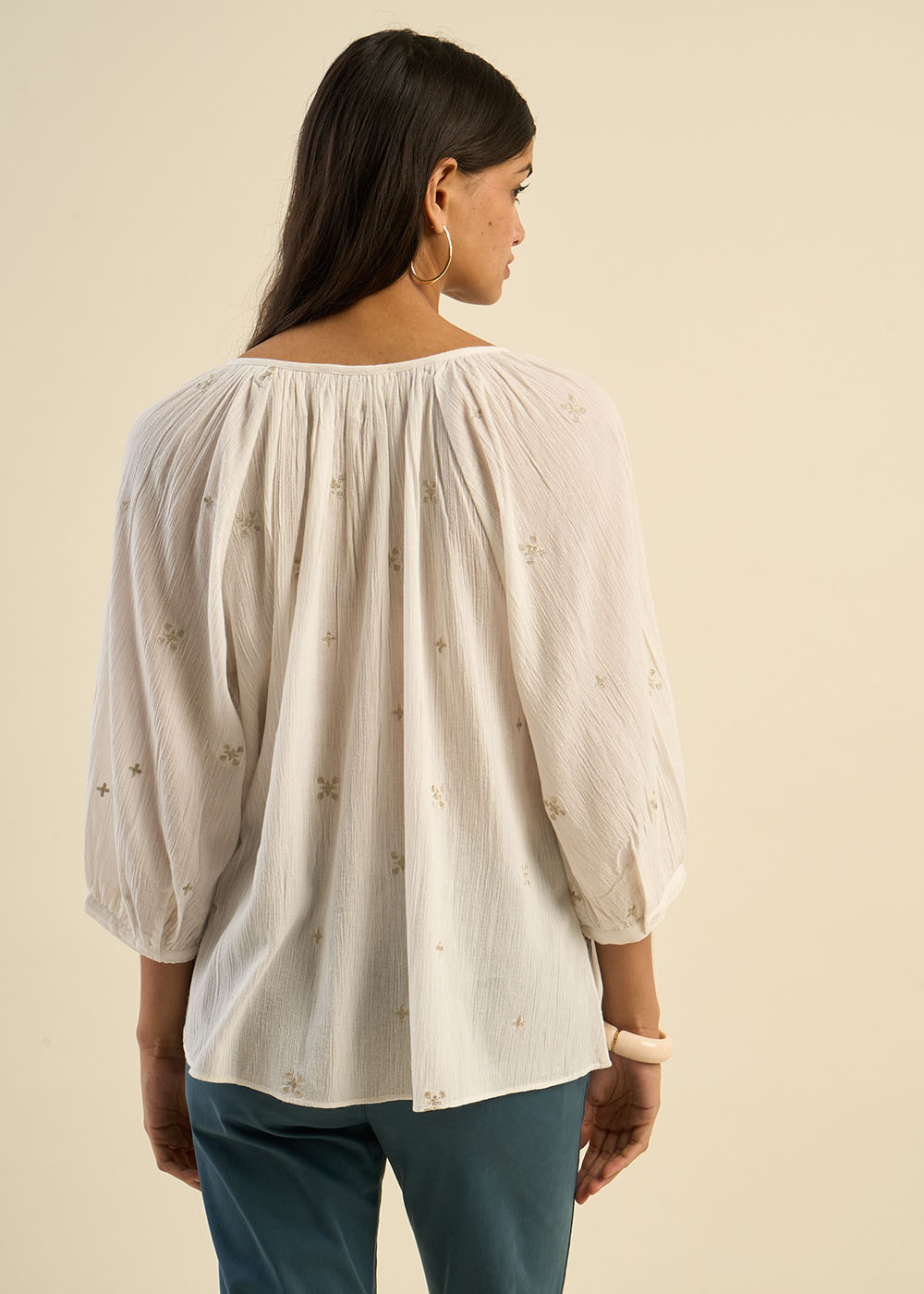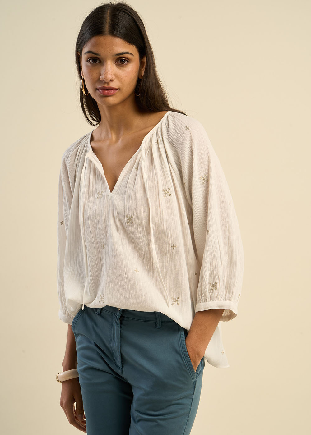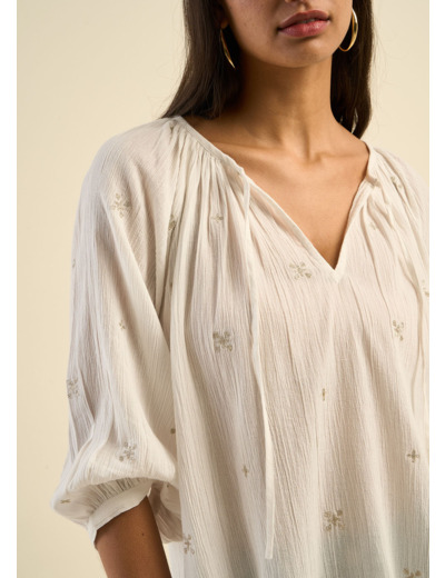 La blouse TAOMA, ample et fluide, séduit par ses délicates broderies en forme de trèfles, apportant une touche de raffinement et de douceur. Confectionnée en gaze de coton elle offre un confort absolu tout en restant élégante. Son col rond à encolure tunisienne nouée et ses manches longues ballon avec emmanchures raglan ajoutent une note bohème et féminine. Une pièce intemporelle qui insufflera charme et légèreté à votre dressing.