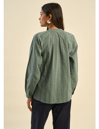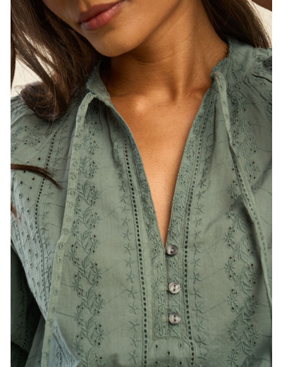 Succombez au charme de notre blouse TOBALO, agrémentée de délicates broderies anglaises qui lui confèrent une allure raffinée et bohème. Confectionnée dans une matière fluide et agréable à porter, elle se distingue par son encolure tunisienne boutonnée, sublimée par un lien orné de pompons. Ses manches raglan apportent une touche de légèreté et d’aisance, tandis que les détails travaillés au col viennent parfaire son élégance.