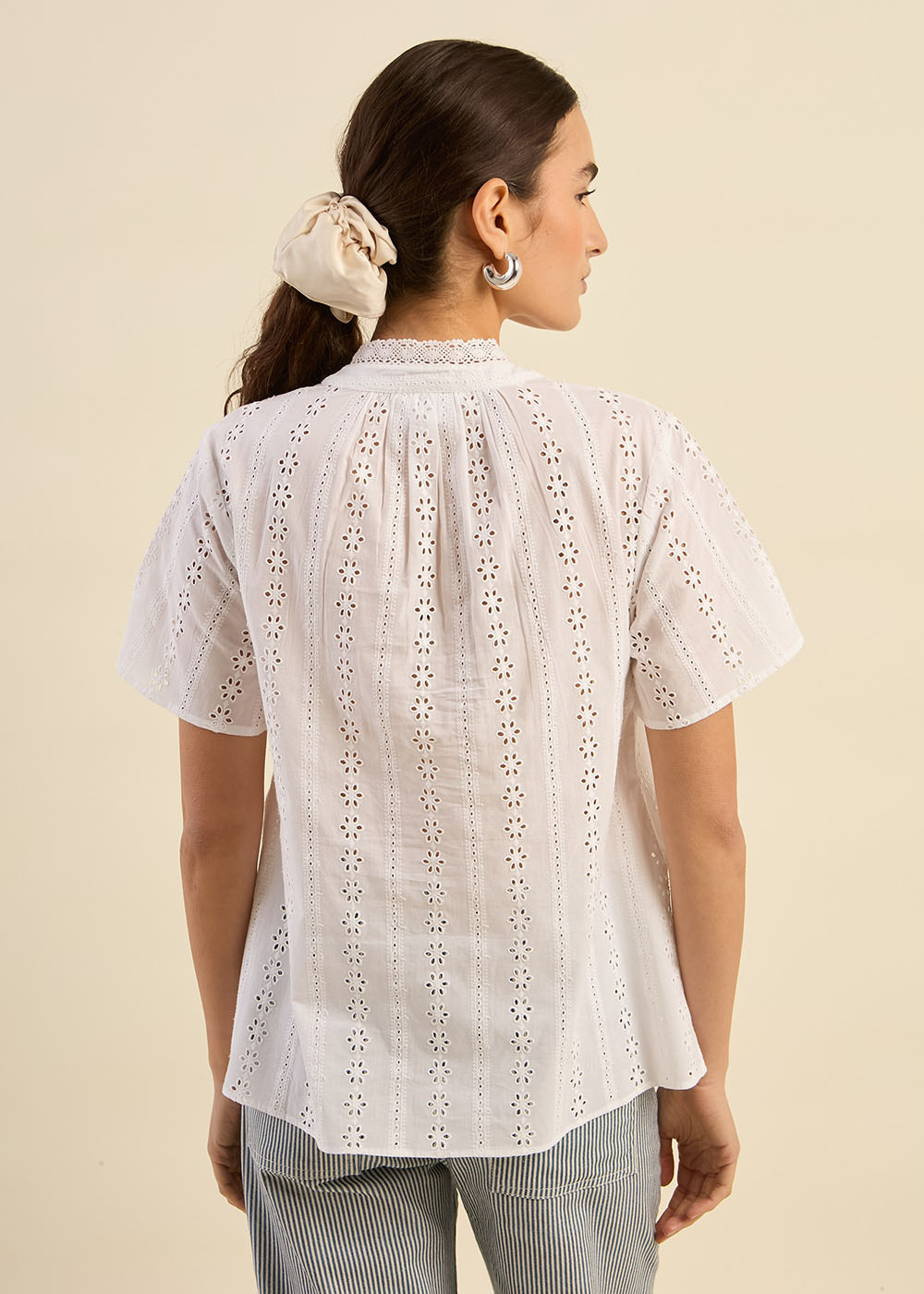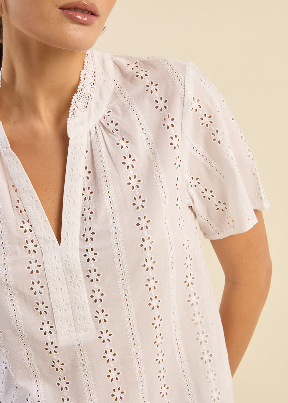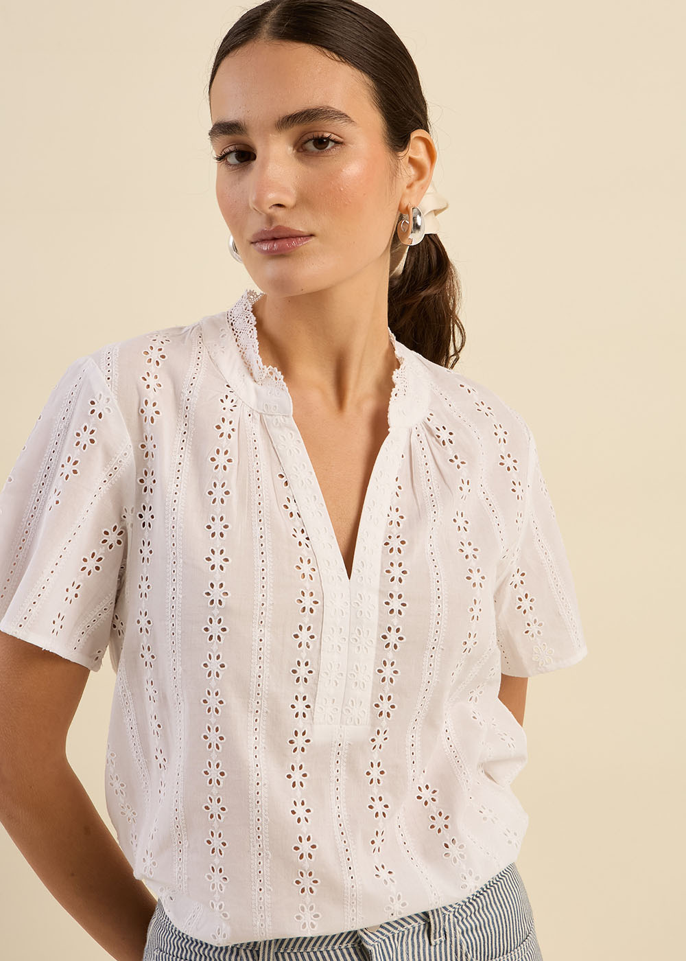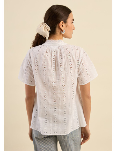 La blouse CILOUNA incarne l’élégance légère et romantique. Confectionnée en broderie anglaise, elle joue sur la transparence pour un effet raffiné et délicat. Son col légèrement volanté et son encolure fendue ajoutent une touche féminine et subtilement bohème. Avec ses manches courtes et sa coupe fluide, elle assure un confort absolu tout en structurant la silhouette avec douceur. Parfaite avec un jean ou une jupe légère, cette blouse est une alliée idéale pour un look chic et décontracté.