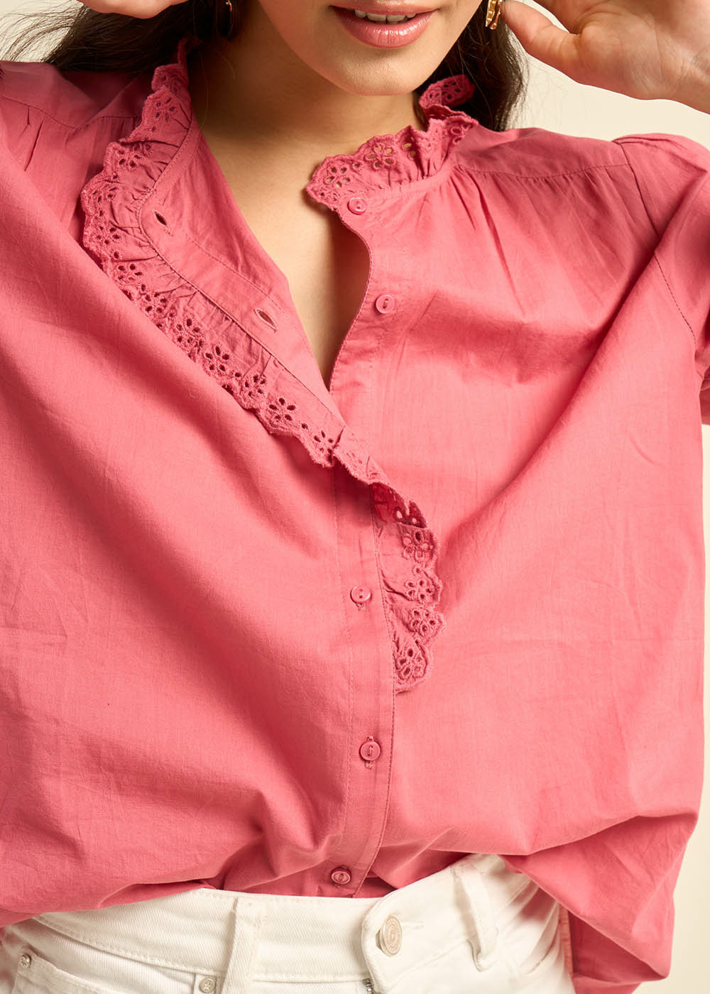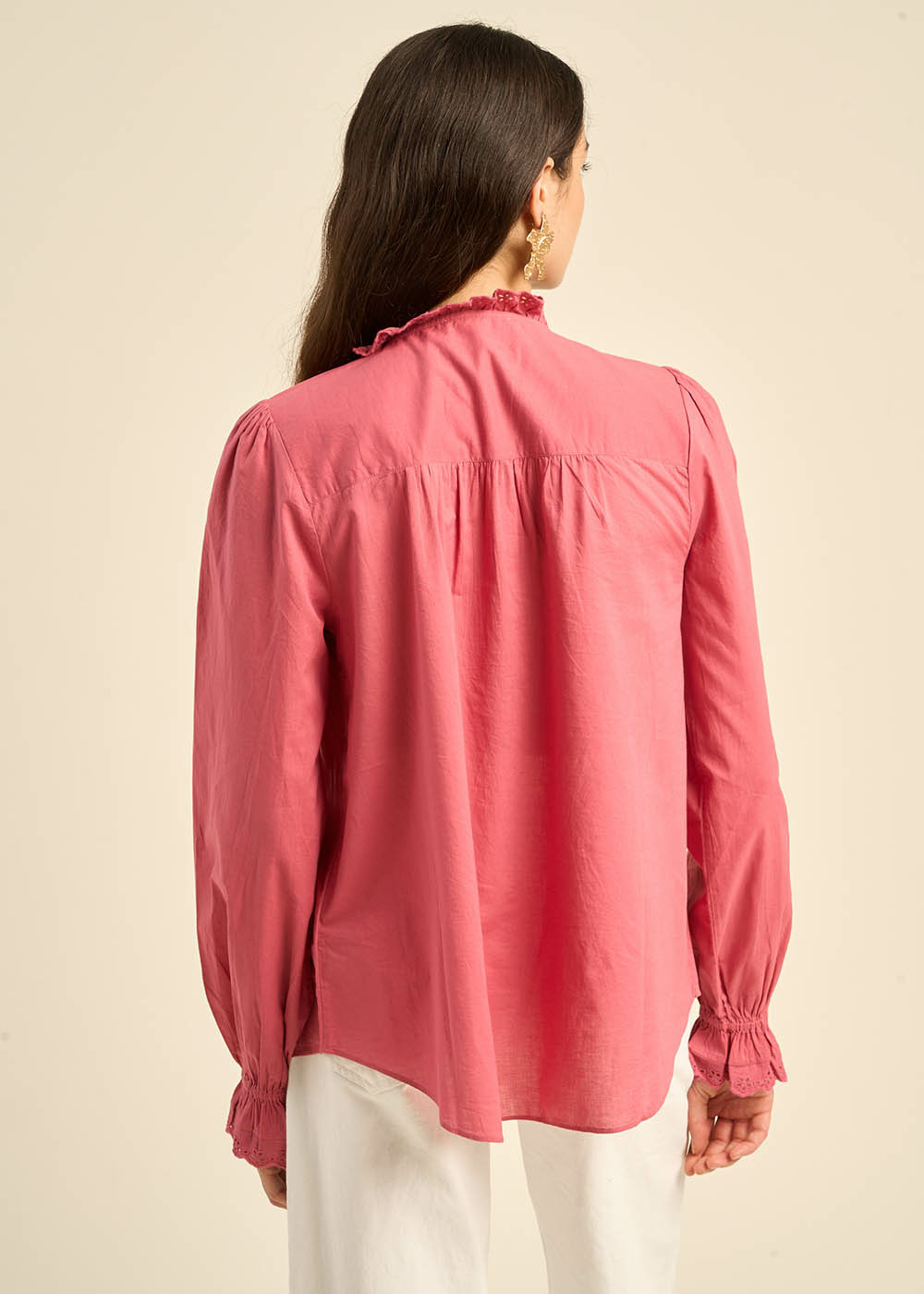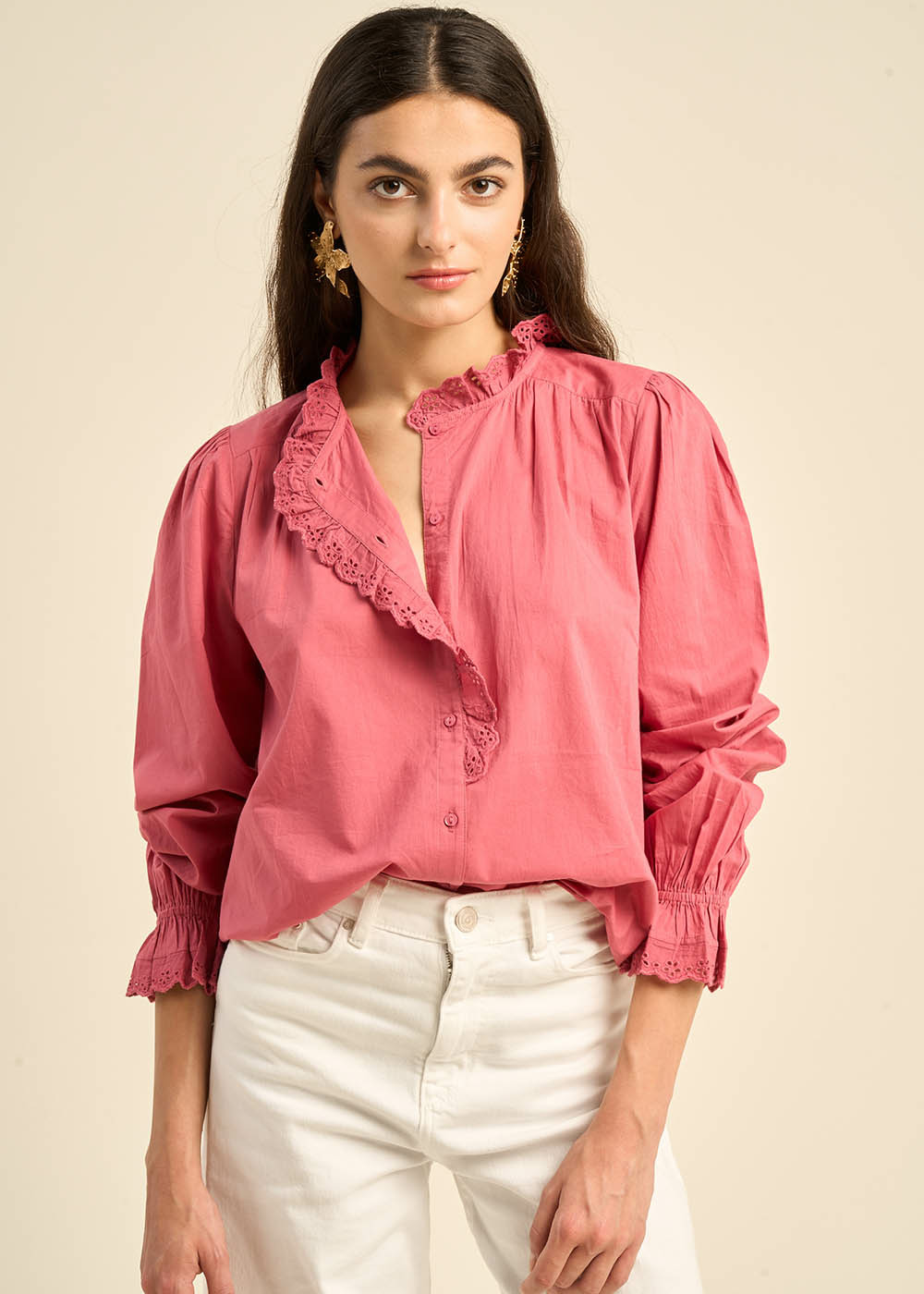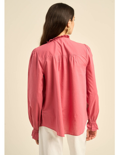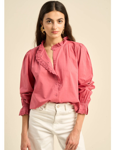 CAMILLIE, une chemise qui incarne la féminité bohème. Son voile de coton, léger et fluide, est sublimé par une bande de broderie délicate qui souligne l'encolure et la patte de boutonnage. La forme liquette et les manches longues avec élastique apportent une touche de confort et de romantisme.
