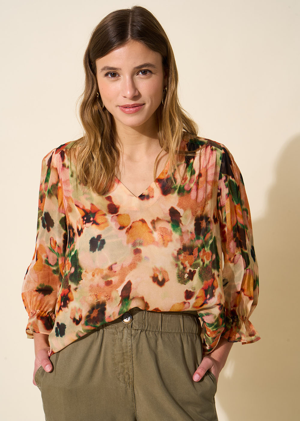 La blouse TOMALIA se distingue par son imprimée vitaminée. Elle détient un col V et des manches 3/4. Portez la avec votre jean favoris.