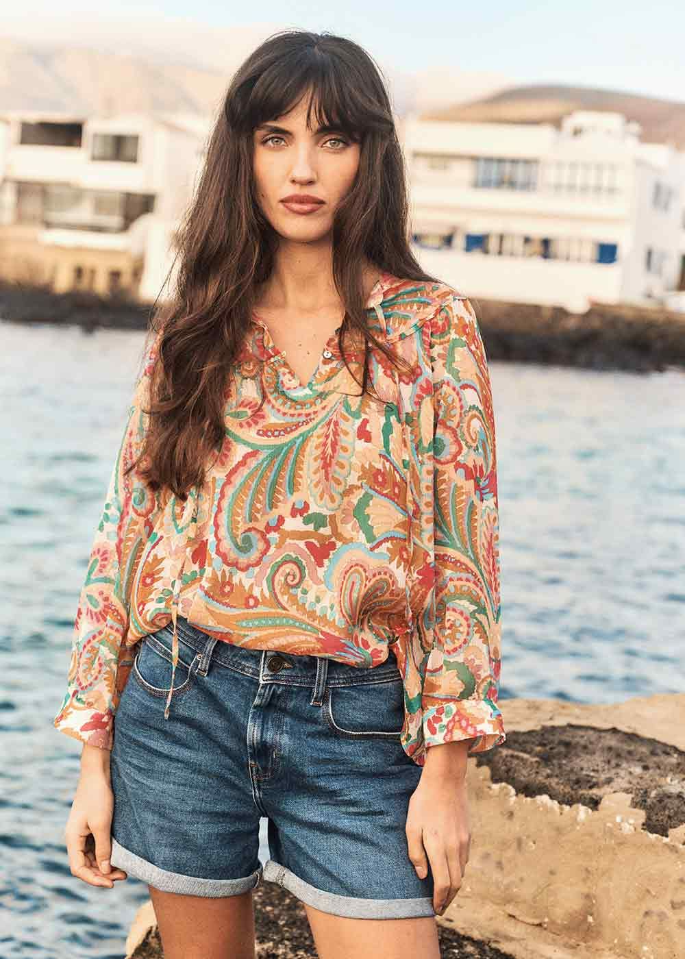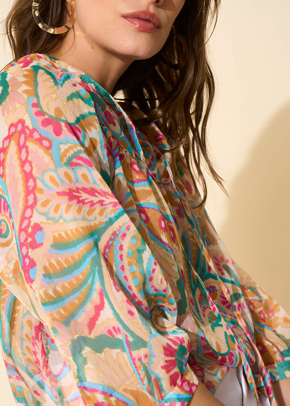 La blouse imprimée TOLIZON est agrémentée de manches 3/4 bouffantes vaporeuses lui conférant une allure romantique et féminine. Vous avez la possibilité de détacher ses liens à l'encolure pour adopter un style plus décontracté et polyvalent ou de les nouer pour un look plus chic et structuré. De plus elle est ornée de volants qui ajoutent une touche supplémentaire de sophistication à cette pièce élégante et tendance.