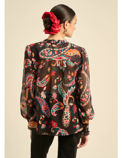 TASHEMIR, une invitation au voyage. Laissez-vous séduire par les motifs cachemire de cette blouse en voile de polyester, un subtil mélange de tradition et de modernité. La légèreté du tissu et les plis délicats créent une silhouette fluide et féminine. Associez-la à un jean flare et des sandales à talons pour un look bohème chic, ou à un pantalon taille haute et un blazer pour une allure plus sophistiquée.