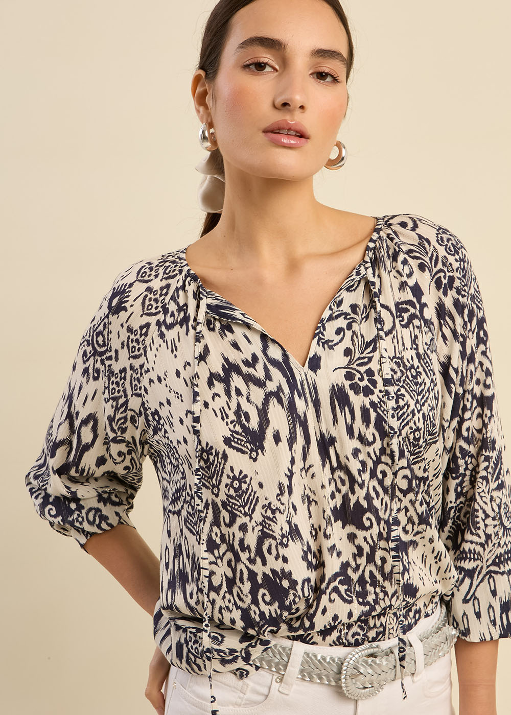 Laissez-vous séduire par notre blouse TOZAMA, imprimée aux motifs ikat bleu marine sublimés par des fils scintillants. Confectionné en viscose fibranne, un tissu léger et souple, elle offre un tombé fluide et une douceur agréable au porter. La rayure lurex intégrée dans le tissage apporte une touche de fantaisie et illumine l'imprimé.