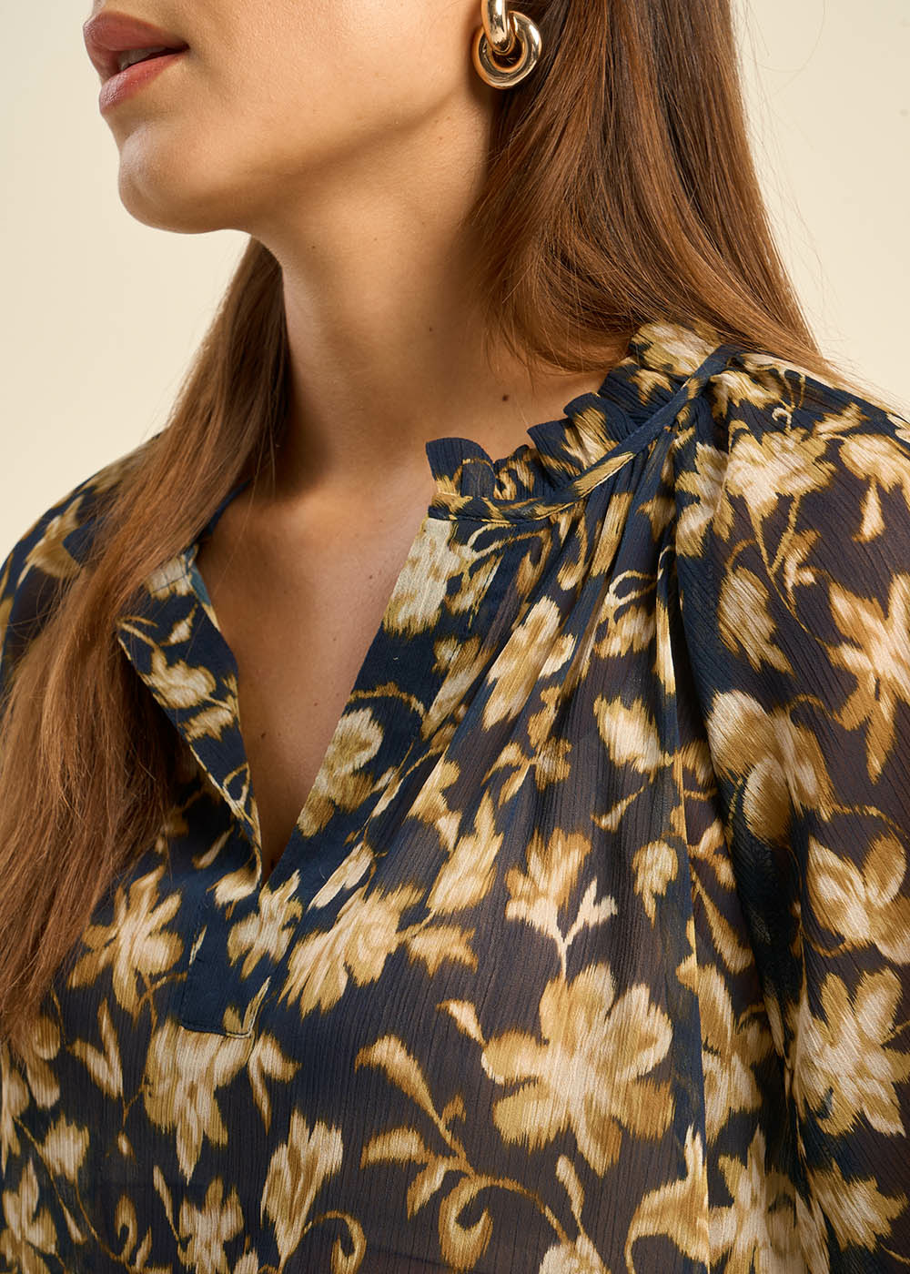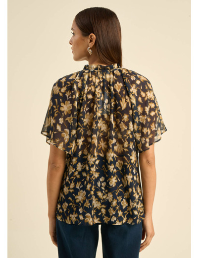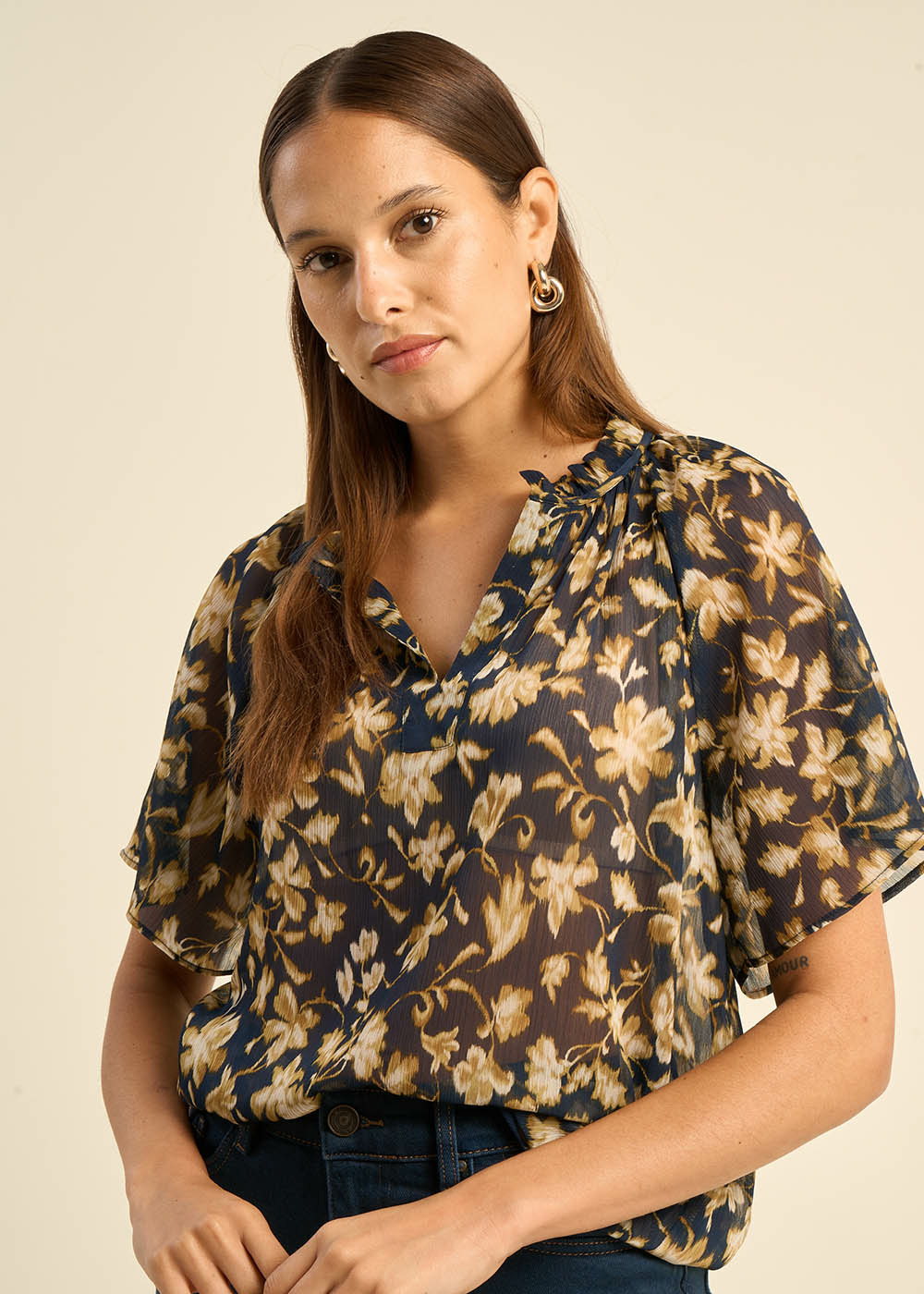TOSILIE, un top qui vous transportera dans un jardin secret. Son voile, léger et fluide, arbore un imprimé floral aquarelle jaune sur fond marine, créant un effet à la fois doux et vibrant. L'encolure tunisienne agrémentée d'un volant et les manches courtes raglan apportent une touche de romantisme et de confort.