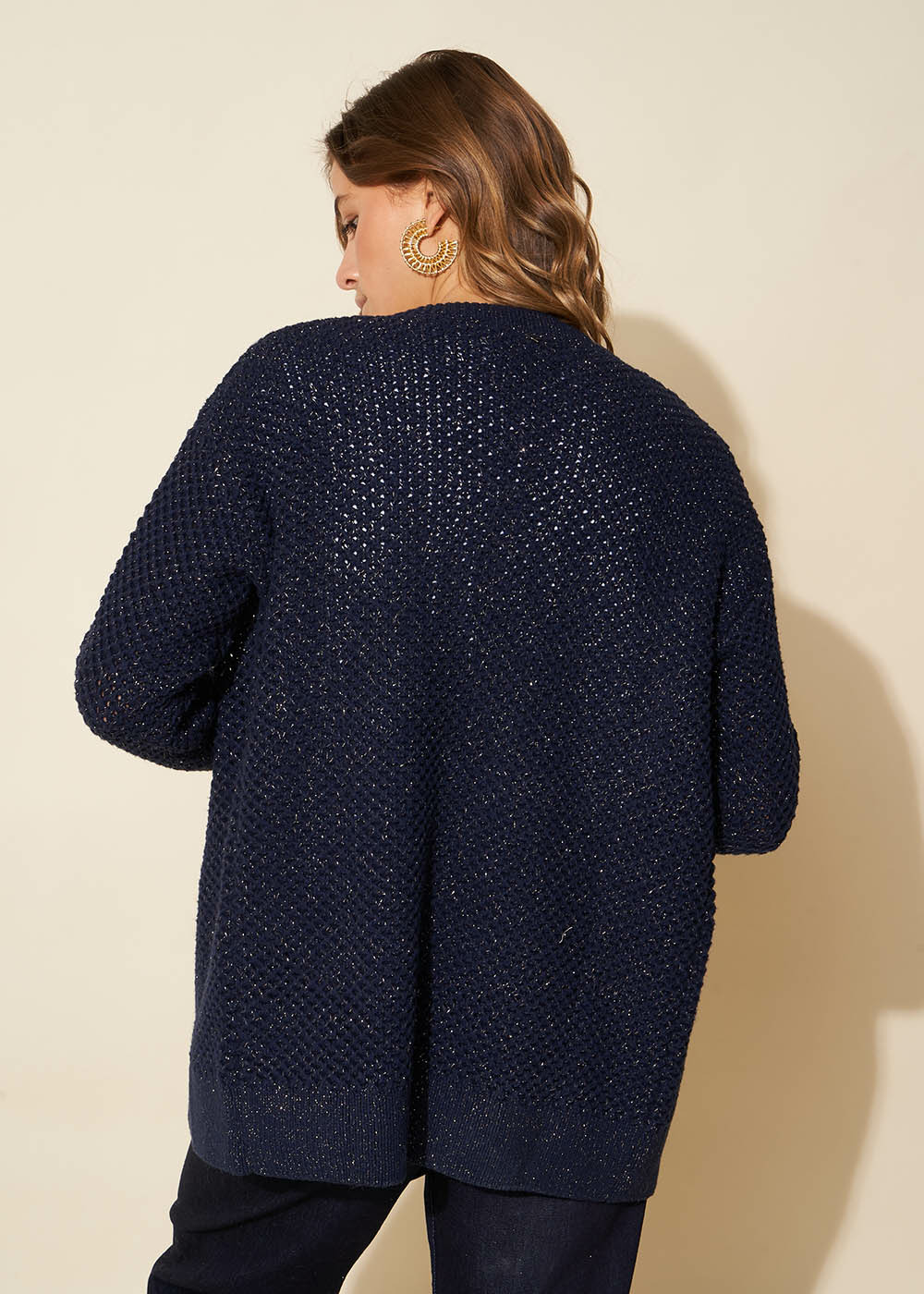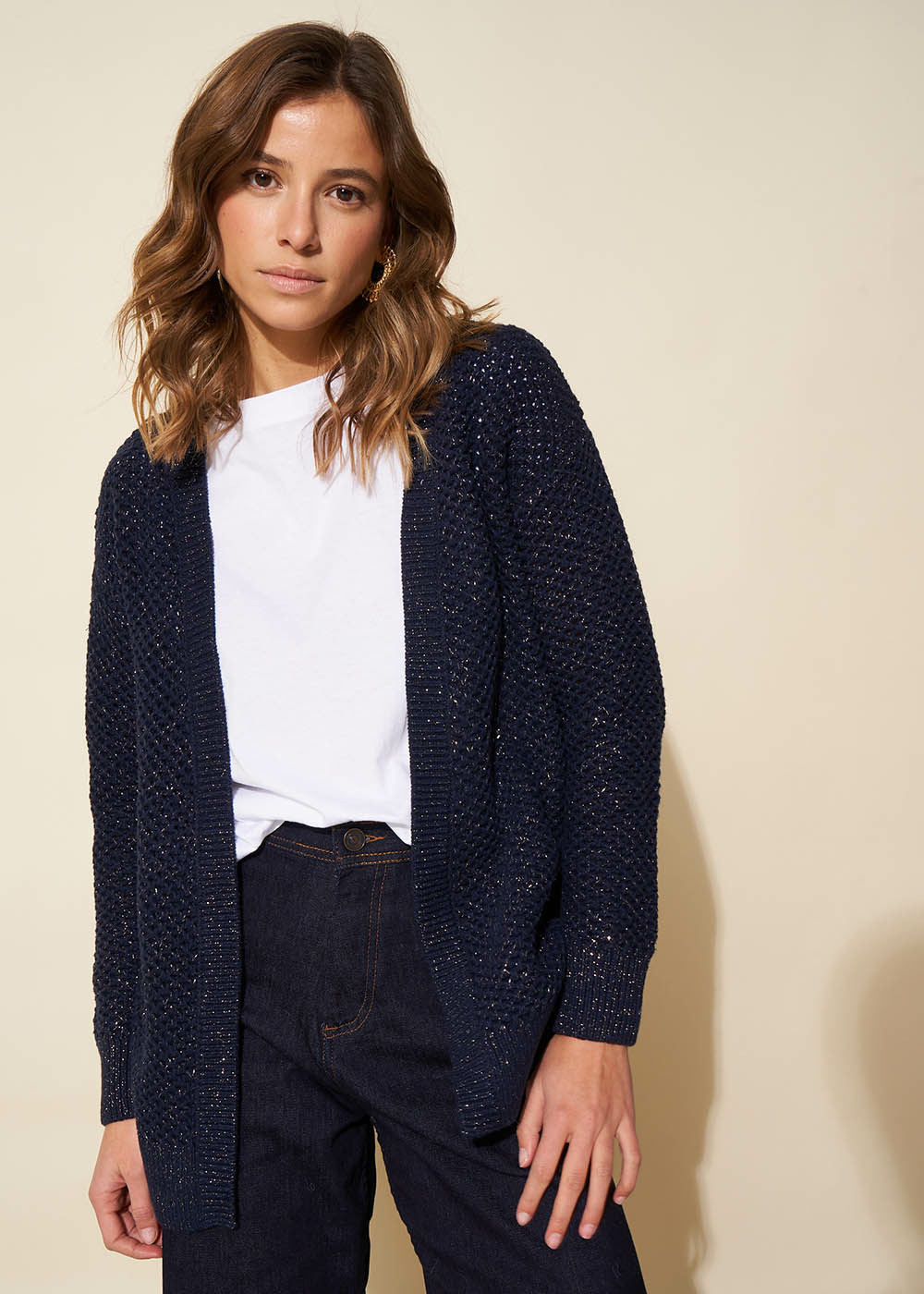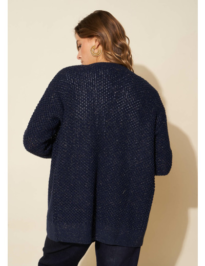 Le cardigan GLADYSA incarne l'élégance décontractée avec son tricotage fantaisie ajouré alliant le confort du coton au glamour du lurex. Sans fermeture il offre un volume large tout en maintenant des manches près du corps créant une silhouette équilibrée. Ce cardigan apporte une touche sophistiquée à toute tenue idéal pour une allure décontractée mais raffinée.