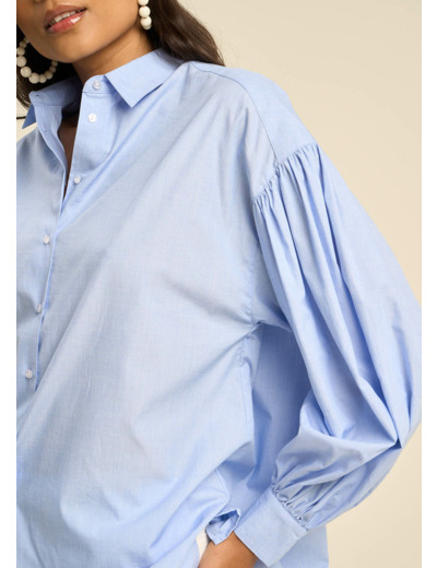 La chemise CATALINA en fils à fils bleu ciel est un éloge à l'élégance décontractée. Son col classique et ses manches longues bouffantes avec poignets ajoutent une touche de sophistication. Les découpes aux épaules et l'empiècement au dos créent une silhouette ample et volumineuse. Parfaite avec un jean écru ou medium stone, elle incarne le mariage idéal du chic et du confort.
