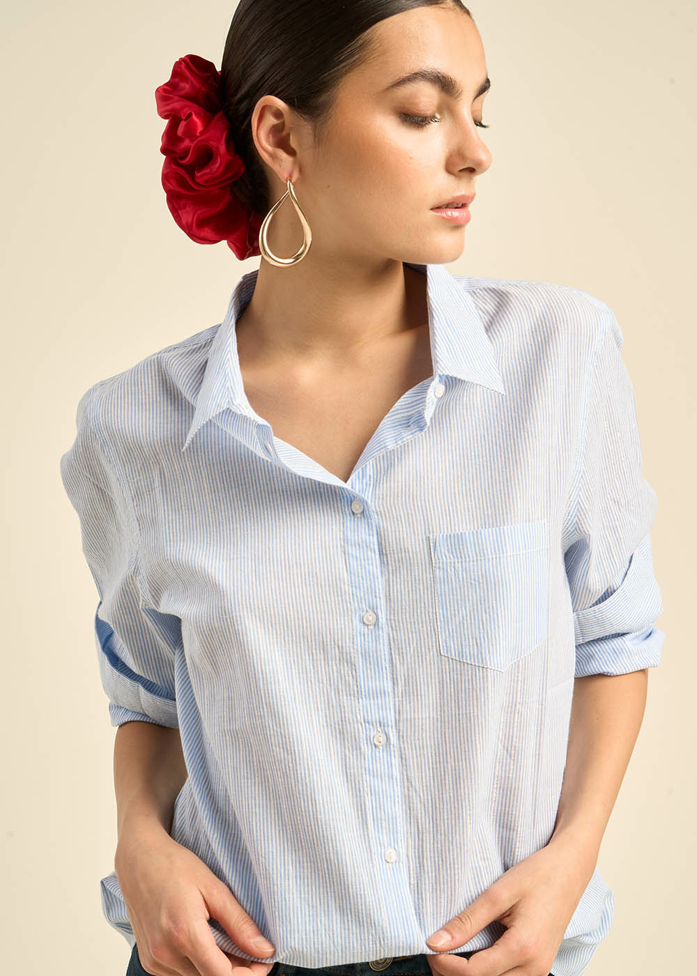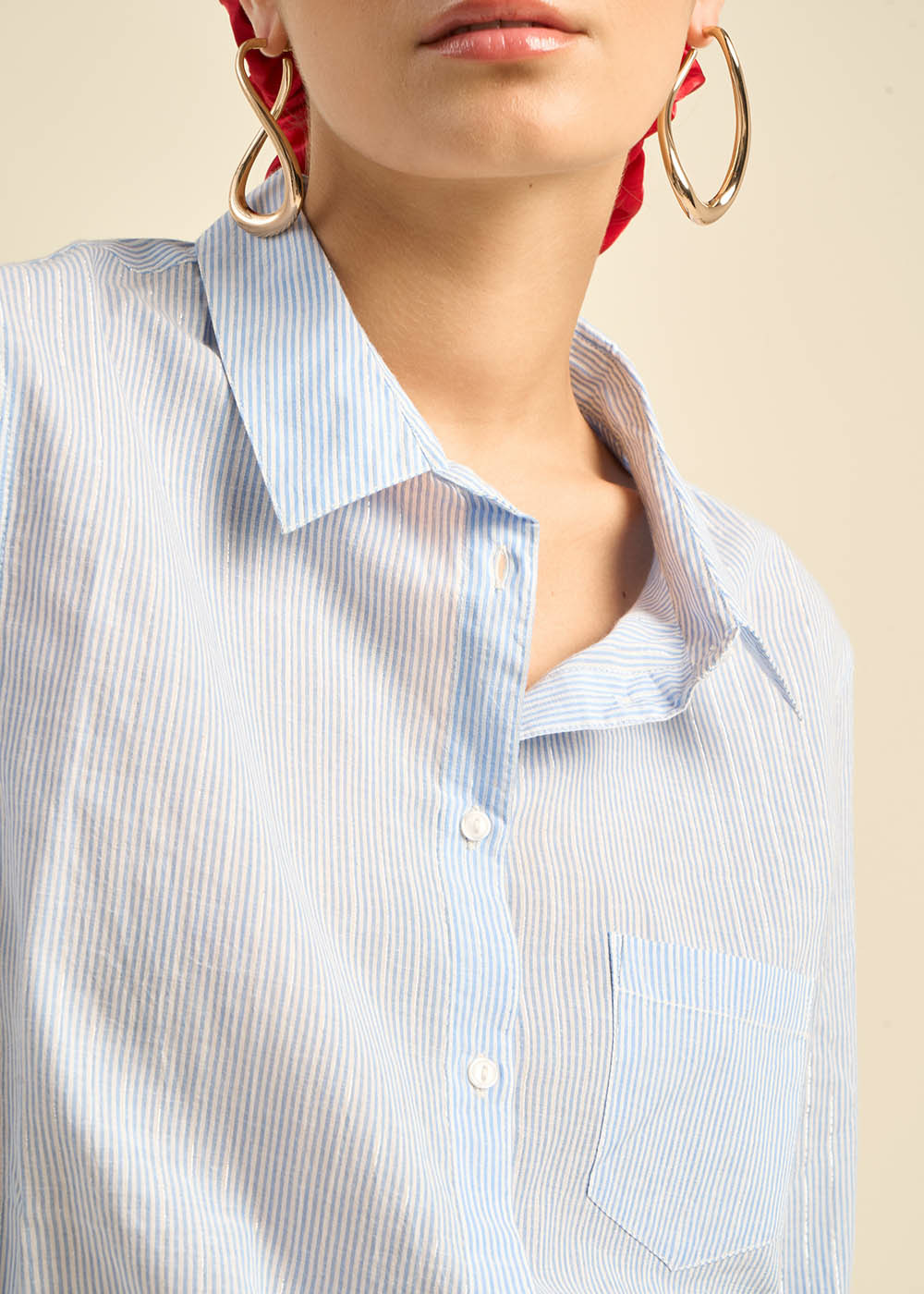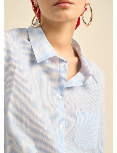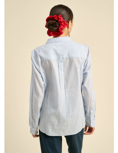 La chemise CATIMA, en coton fils à fils bleu ciel avec des fils lurex, allie élégance et confort. Sa coupe classique près du corps et ses manches longues en font une pièce intemporelle. Le col classique et la poche plaquée sur le devant ajoutent une touche pratique, tandis que la forme liquette du bas de chemise apporte une note de modernité. Une chemise parfaite pour un look chic et raffiné.