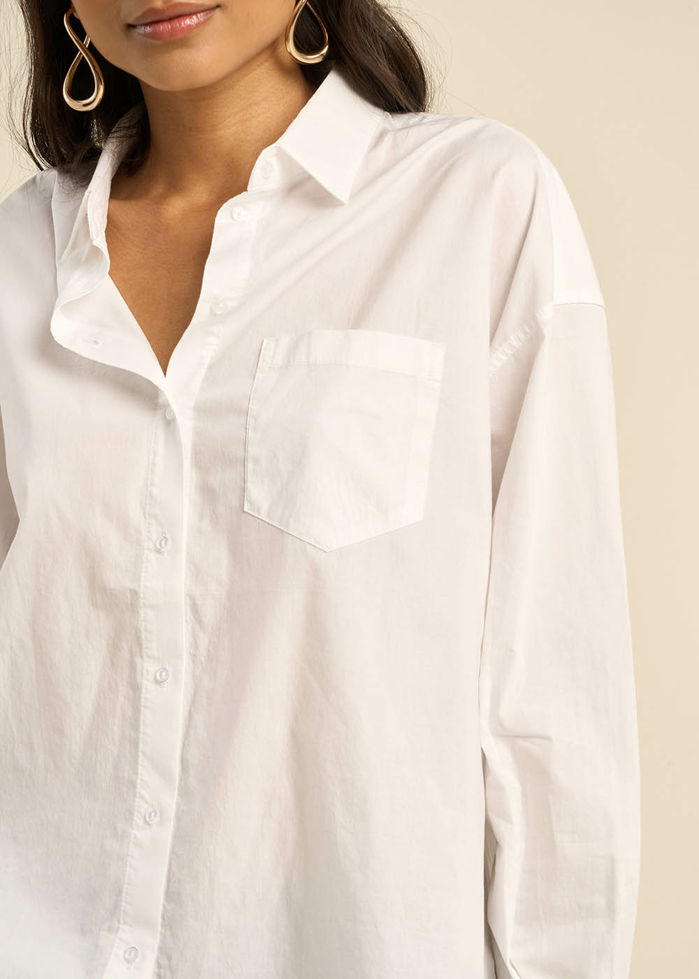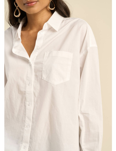 La chemise blanche CELISE a une coupe oversize. Cette chemise en 100% Coton est un basique incontournable pour une garde-robe moderne. Elle présente une poche poitrine et des manches tombantes, alliant confort et style pour un look décontracté chic.