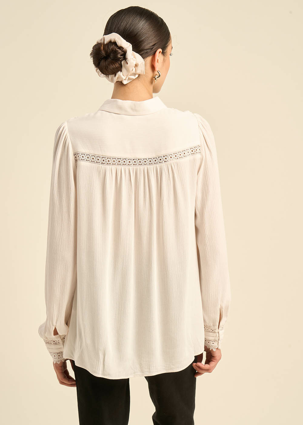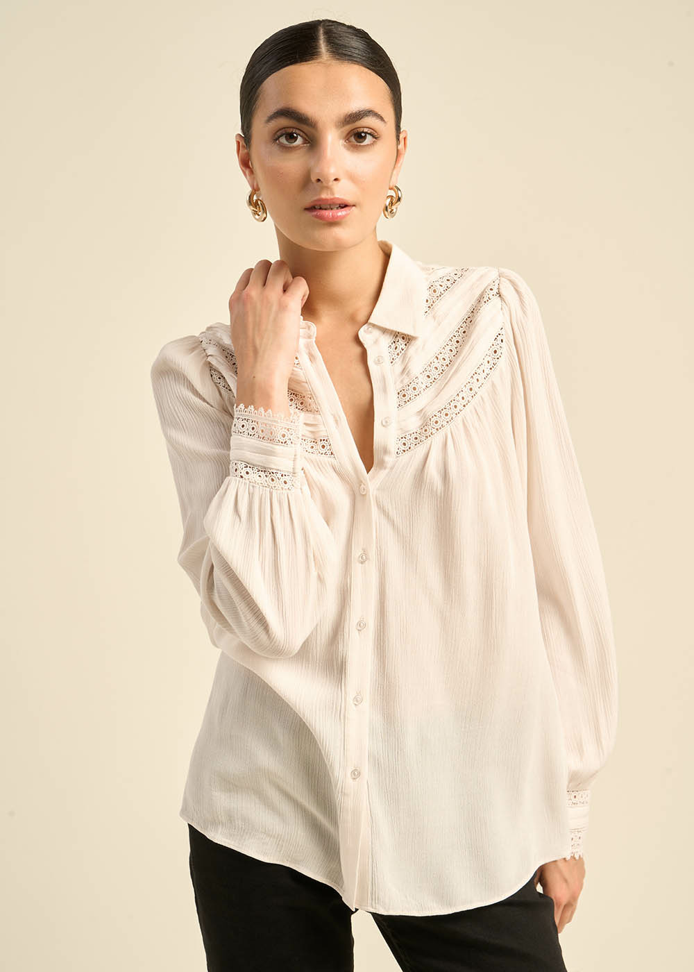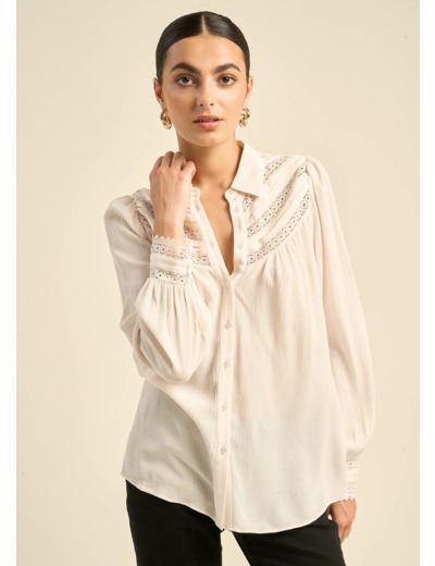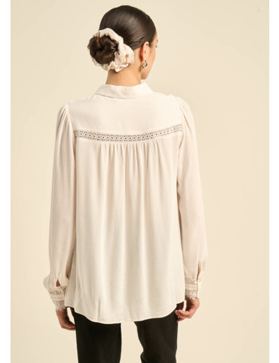 CARMILA, la chemise qui incarne la féminité bohème. Son col classique et sa patte de boutonnage lui confèrent une allure intemporelle, tandis que l'incrustation de dentelle sur le devant et les manches bouffantes apportent une touche romantique et bohème. Les fronces ajoutent du volume et de la légèreté à cette pièce unique. Disponible en écru et noir, elle s'adaptera à toutes vos envies.