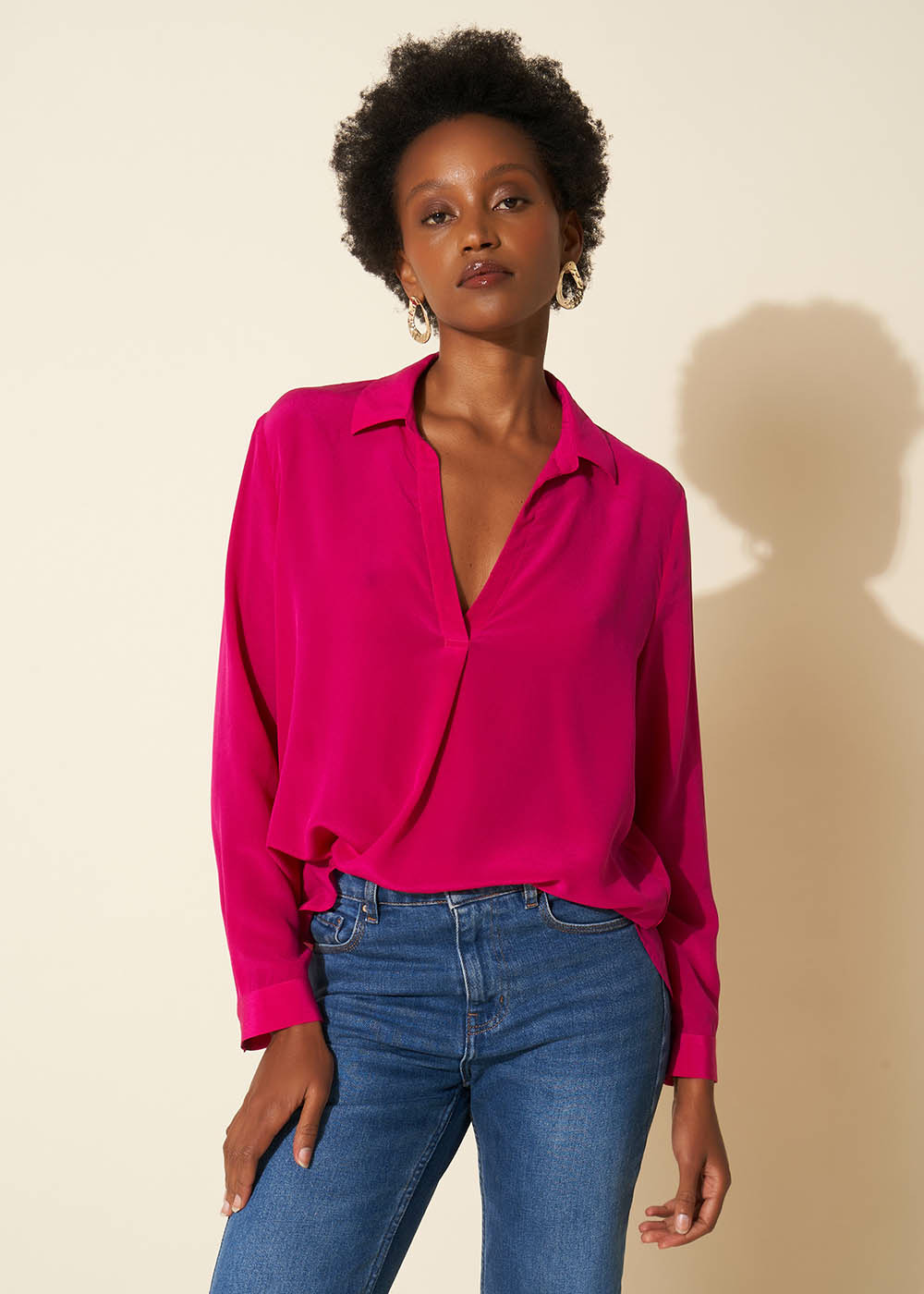La blouse TIBLA promet élégance et légèreté avec sa composition 100% soie. Elle se compose d'un col chemise et de manches longues avec les poignets boutonnés. Portez-la avec votre jean favori.
