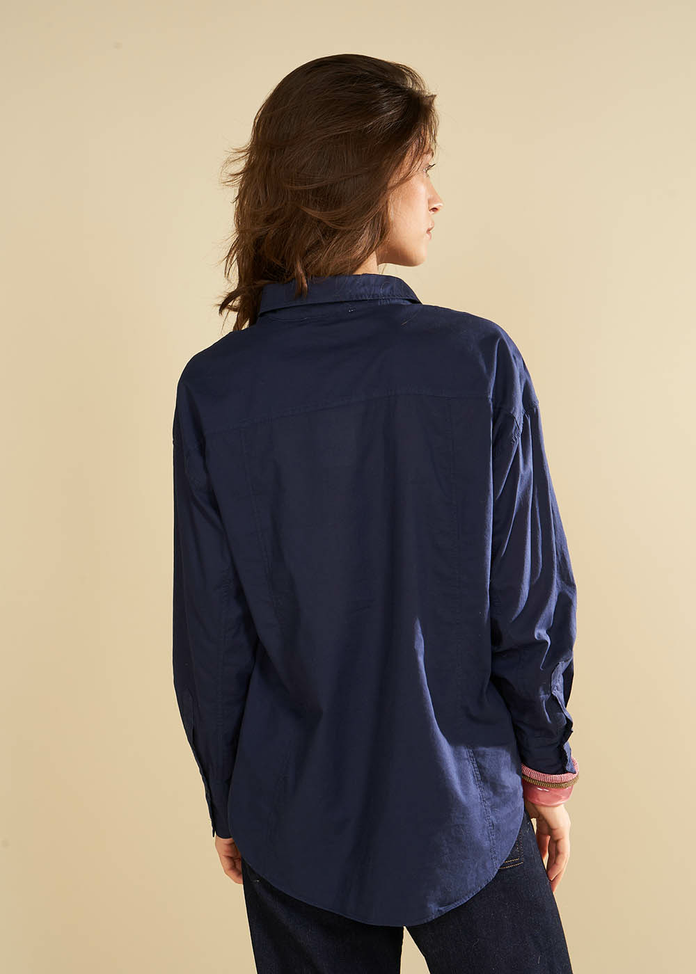 La chemise CHARLISE se présente en coupe oversize agrémentée de poches plaquées à l'avant. Ses manches longues sont pourvues d'un large poignet à trois boutons et d'une fente élégante. Elle comporte également des empiècements aux épaules et au dos ajoutant une touche distinctive à son design.