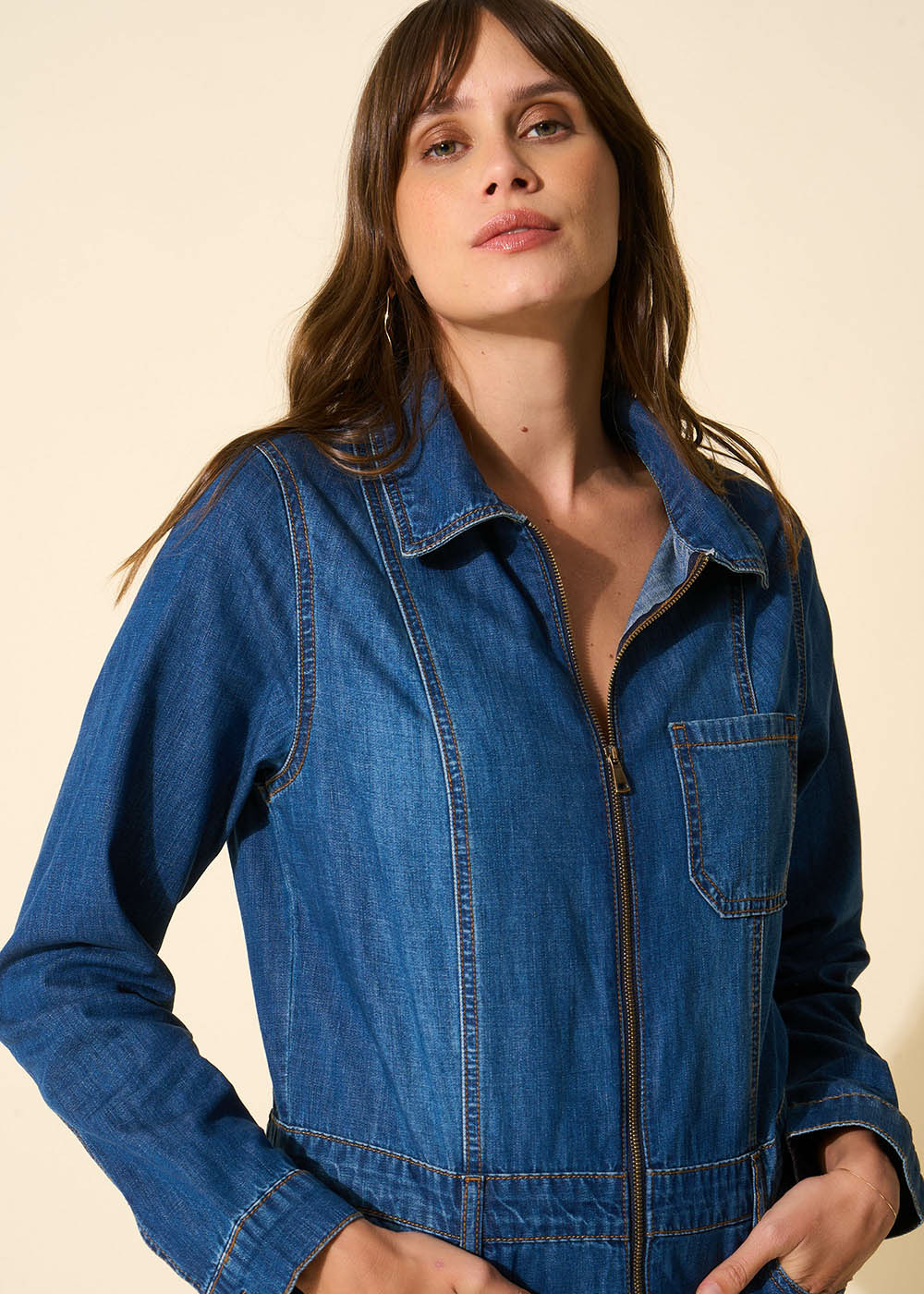 La combinaison en jean CLARYA incarne une allure à la fois pratique et sophistiquée avec ses manches longues et son col chemise, soulignés par une poche pratique sur la poitrine à gauche. Agrémentée d'une fermeture à zip sur le devant, elle offre une silhouette élégante avec ses jambes droites, idéale pour une journée décontractée en ville ou une sortie entre amis.