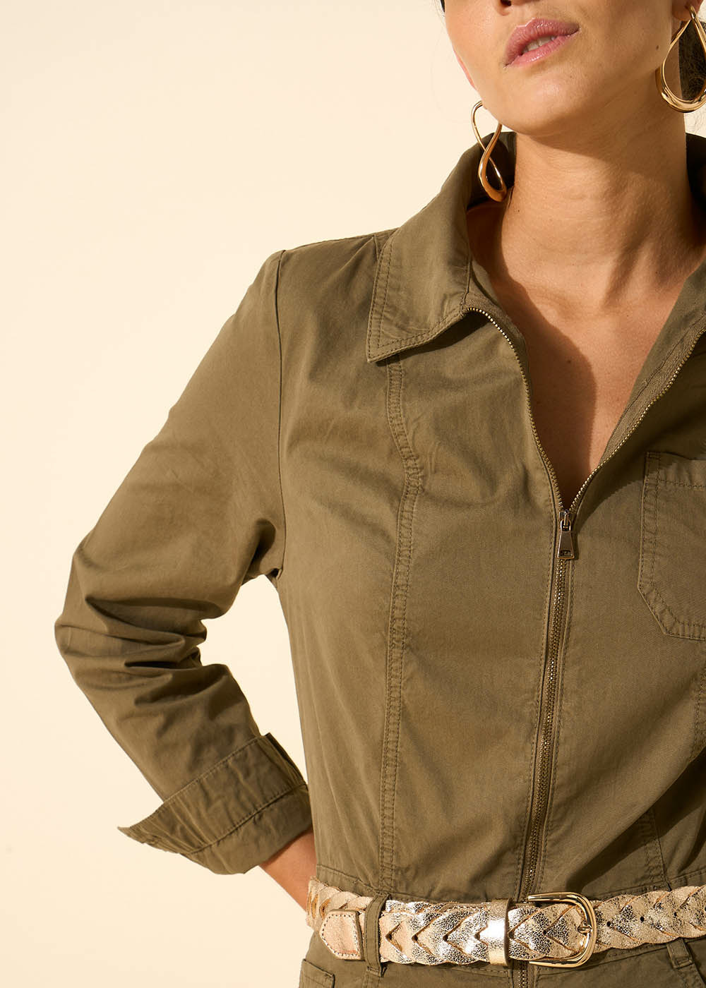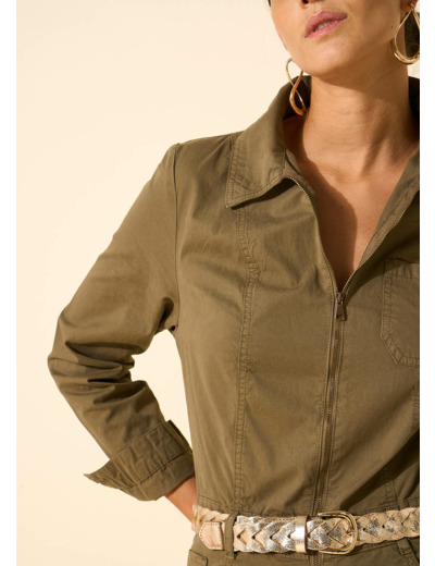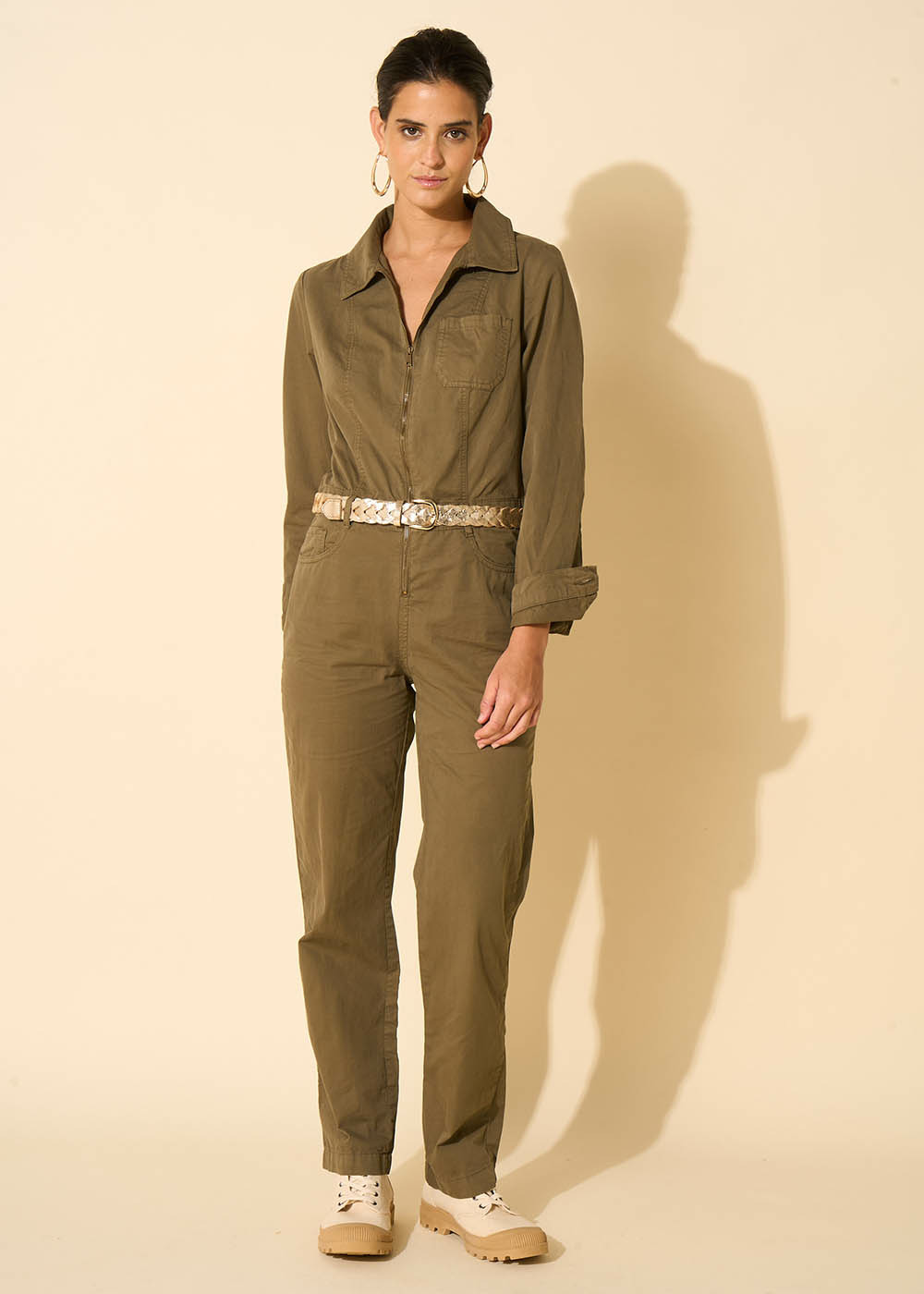 La combinaison CAMILLA incarne une allure à la fois pratique et sophistiquée avec ses manches longues et son col chemise, soulignés par une poche pratique sur la poitrine à gauche. Agrémentée d'une fermeture à zip sur le devant, elle offre une silhouette élégante avec ses jambes droites, idéale pour une journée décontractée en ville ou une sortie entre amis.