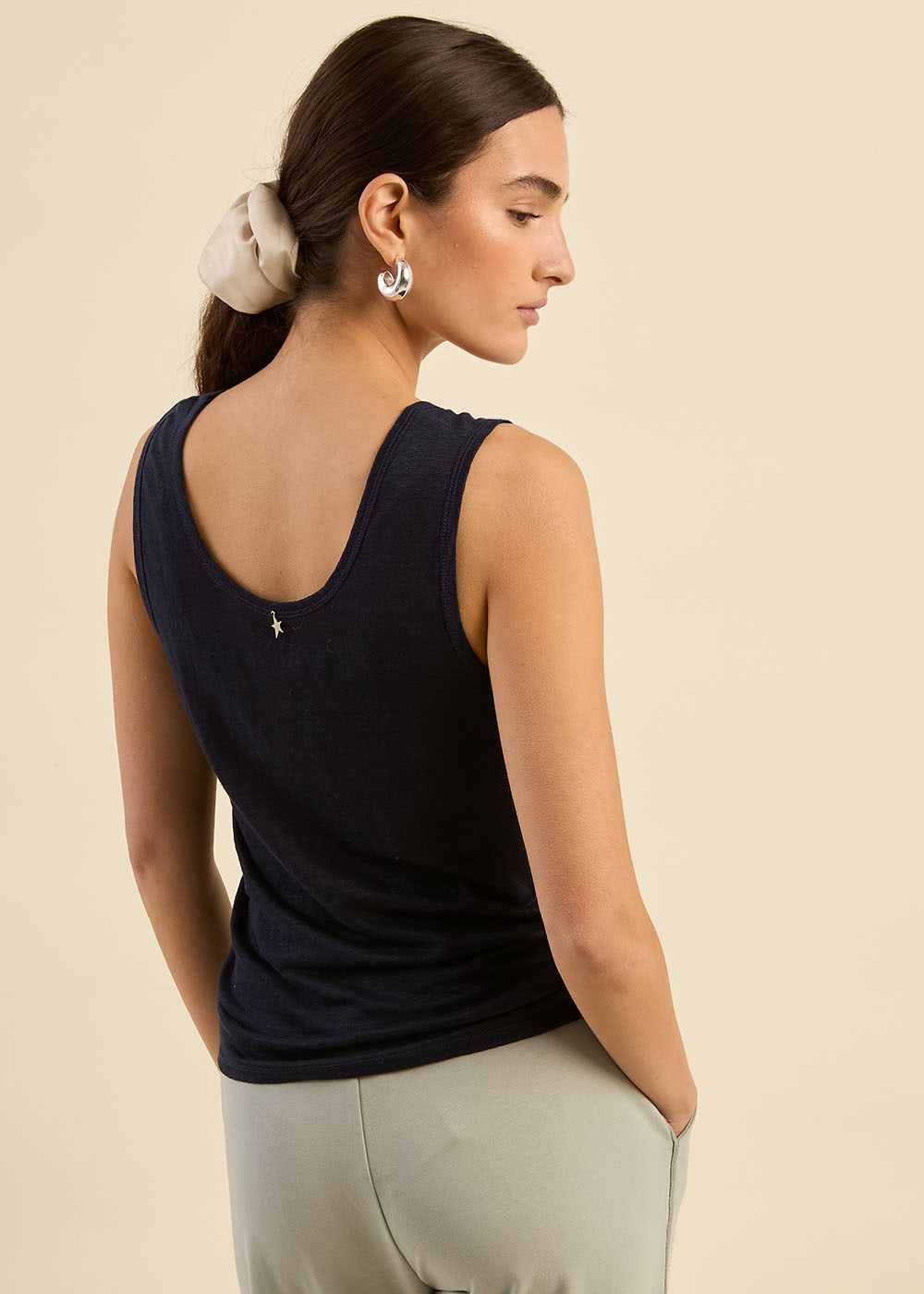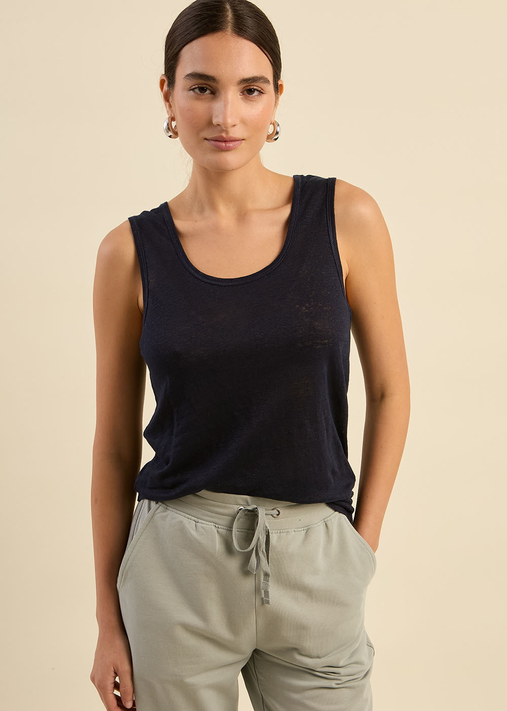 Le débardeur DELYA allie légèreté et élégance avec son col rond et profond, créant un décolleté flatteur. Confectionné en lin, il offre une sensation de fraîcheur et de confort tout au long de la journée. Ses épaules larges et sa coupe fluide en font une pièce agréable à porter en toute saison. Le détail de la surpiqûre en lurex au niveau du col et des emmanchures ajoute une touche subtilement brillante et originale. Ce débardeur se porte facilement avec un pantalon ou une jupe pour un look à la fois décontracté et chic.