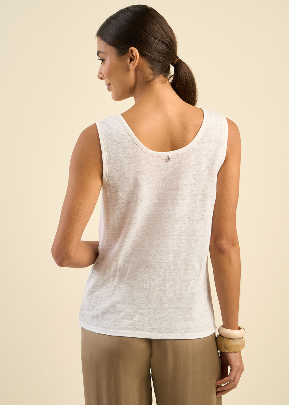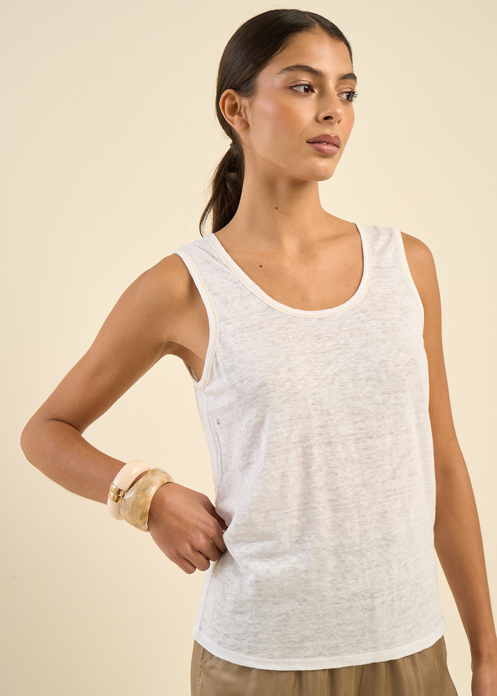 Le débardeur DELYA allie légèreté et élégance avec son col rond et profond, créant un décolleté flatteur. Confectionné en lin, il offre une sensation de fraîcheur et de confort tout au long de la journée. Ses épaules larges et sa coupe fluide en font une pièce agréable à porter en toute saison. Le détail de la surpiqûre en lurex au niveau du col et des emmanchures ajoute une touche subtilement brillante et originale. Ce débardeur se porte facilement avec un pantalon ou une jupe pour un look à la fois décontracté et chic.