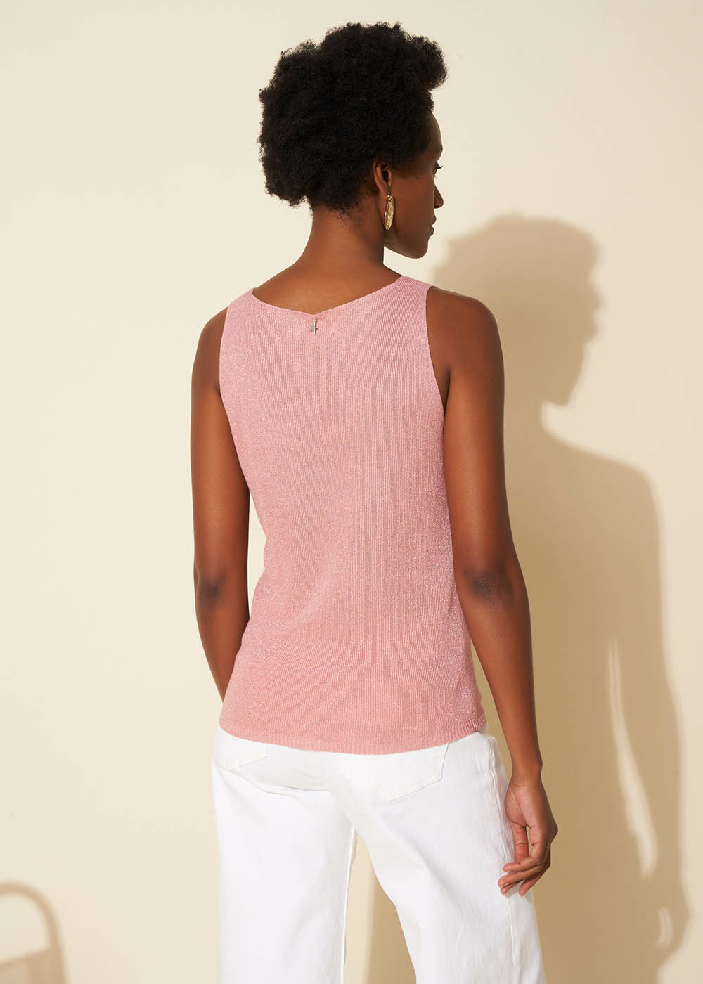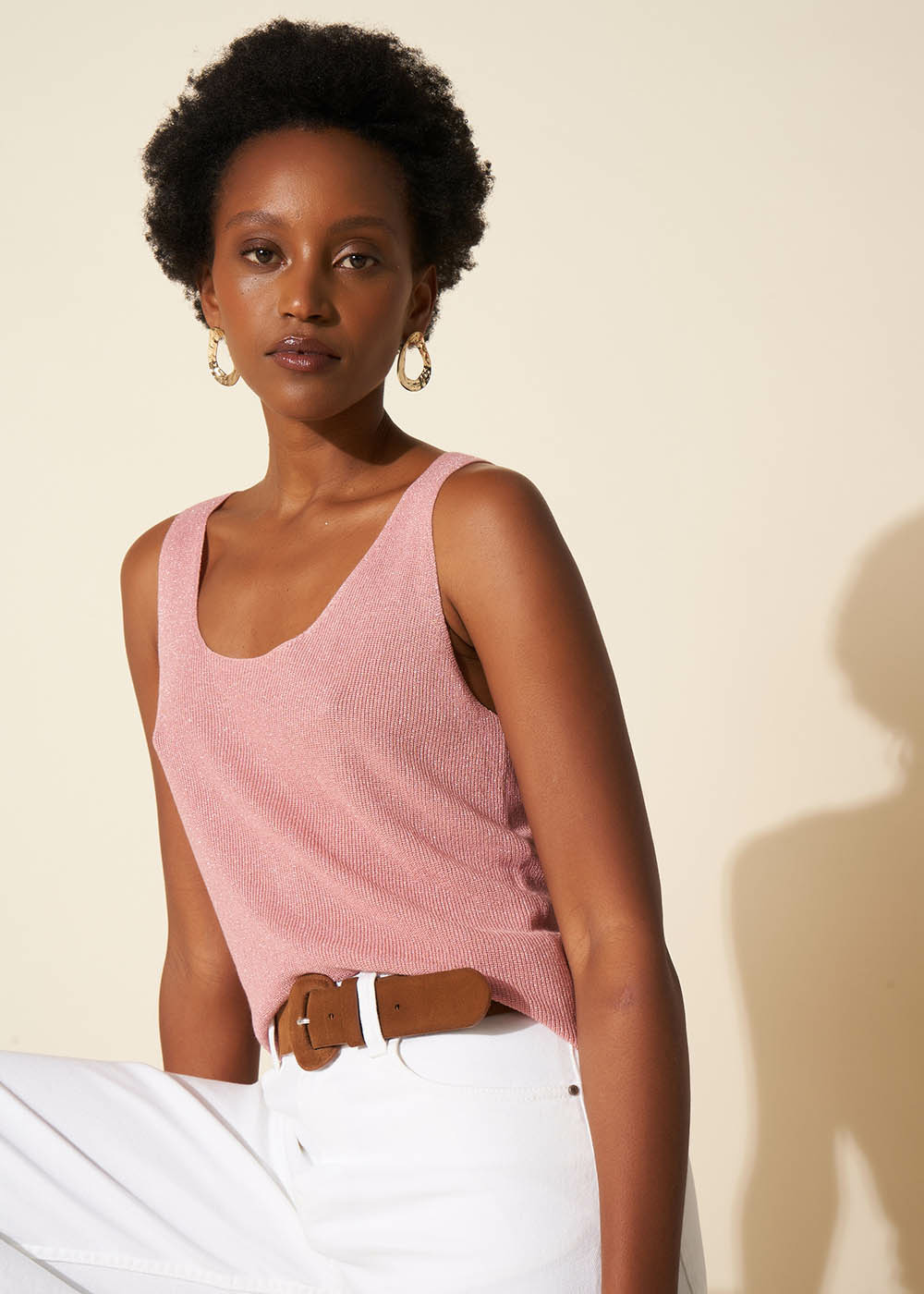 Le DIBA est un débardeur à encolure ronde fabriqué dans une maille scintillante grâce à l'utilisation de fibres métallisées. Avec une coupe moderne et ample il est adapté aussi bien pour des tenues décontractées que pour des looks plus chics