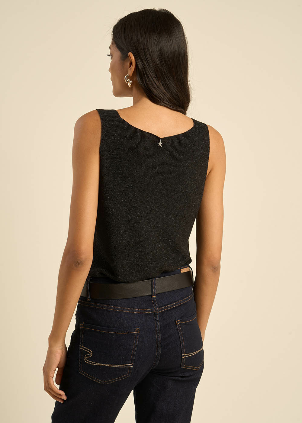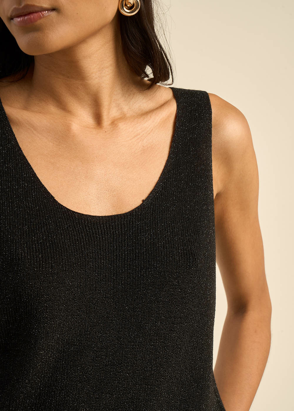 Le DIBA est un débardeur à encolure ronde fabriqué dans une maille scintillante grâce à l'utilisation de fibres métallisées. Avec une coupe moderne et ample il est adapté aussi bien pour des tenues décontractées que pour des looks plus chics