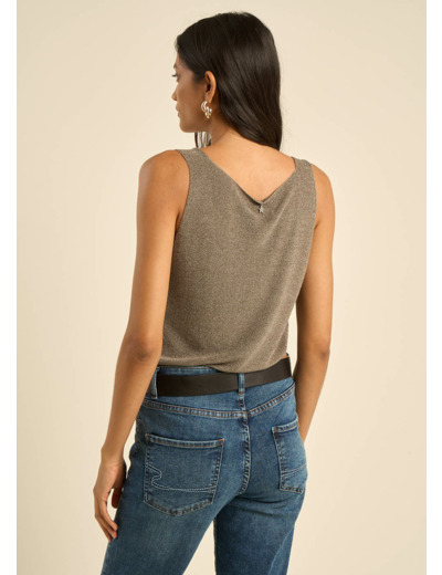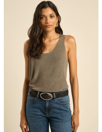 Le DIBA est un débardeur à encolure ronde fabriqué dans une maille scintillante grâce à l'utilisation de fibres métallisées. Avec une coupe moderne et ample il est adapté aussi bien pour des tenues décontractées que pour des looks plus chics