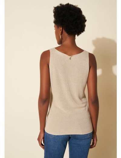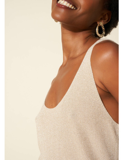 Le DIBA est un débardeur à encolure ronde fabriqué dans une maille scintillante grâce à l'utilisation de fibres métallisées. Avec une coupe moderne et ample il est adapté aussi bien pour des tenues décontractées que pour des looks plus chics