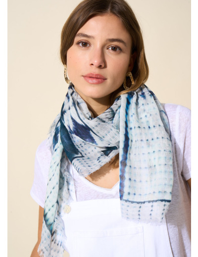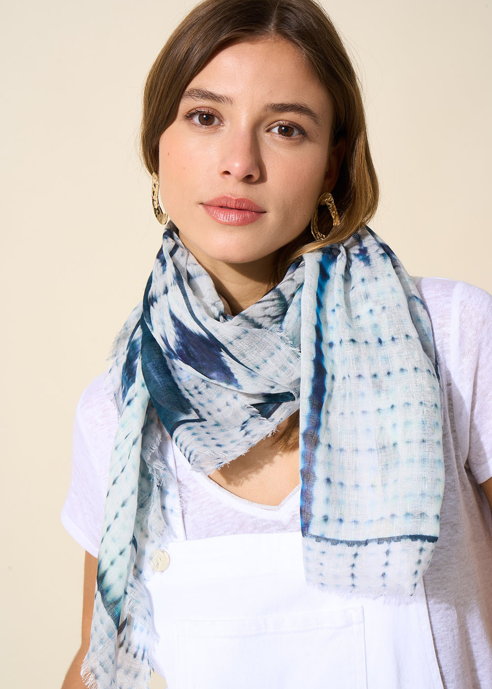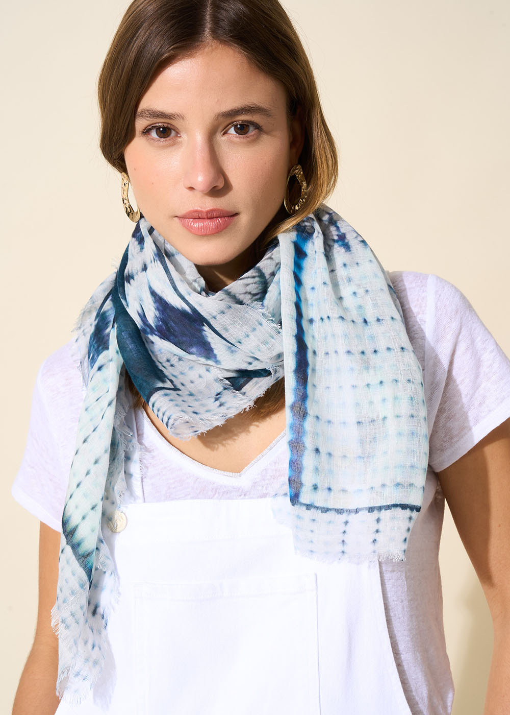 Le foulard ELEA se distingue par son délicat imprimé tie and dye bleu. Portez-le pour ajouter une touche vitaminée à vos tenues neutres.