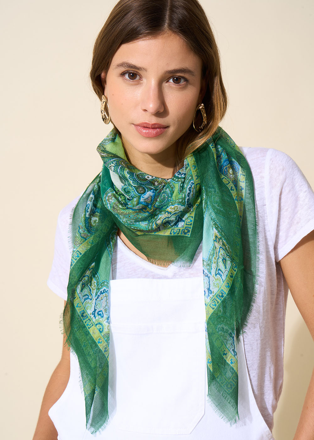 Le foulard EOLYA se distingue par son délicat imprimé cachemire vert. Il est constitué à 10% de soie, matière noble qui promet chaleur et douceur. Portez-le pour ajouter une touche vitaminée à vos tenues neutres.