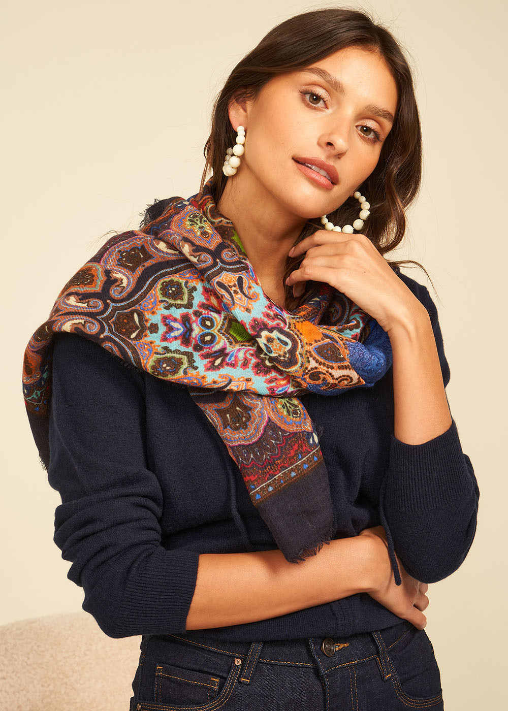 Le foulard EBEN se distingue par son imprimé élégant. Il est majoritairement composé de laine il promet chaleur et confort.