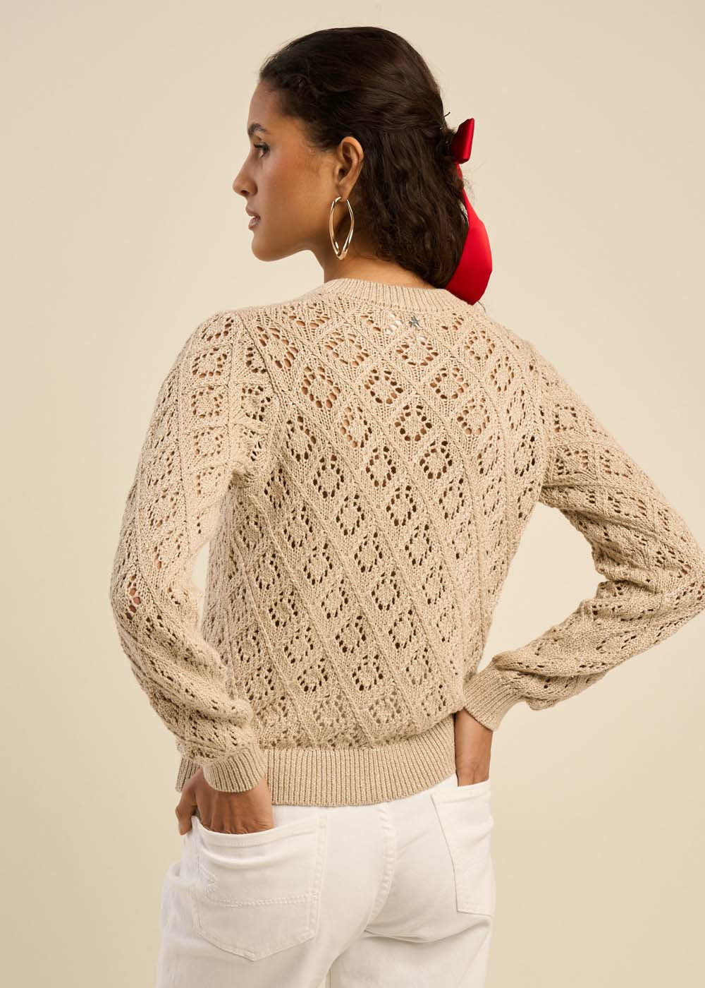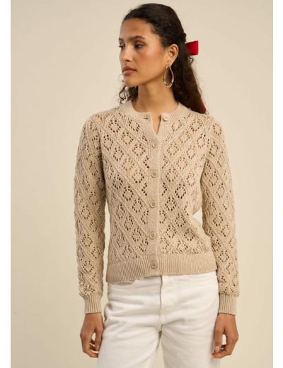 Le gilet GELIA séduit par son jeu de points ajourés et sa maille pointelle, créant une texture délicate et légère. Son col rond et ses bords-côtes à l'encolure, aux bas de manches et au bas du vêtement apportent une finition soignée. Le fil lurex intégré ajoute une touche de brillance subtile, parfaite pour un look à la fois casual avec un jean ou plus chic avec un pantalon habillé. Un gilet polyvalent qui allie confort et élégance.