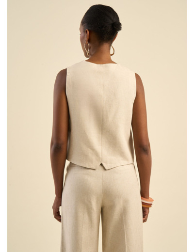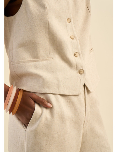 Le gilet sans manches GASTALI, en viscose et lin, est conçu pour une silhouette légère et élégante. Doté d'une ouverture au milieu devant avec des boutons ton sur ton, il offre une touche de sophistication discrète. Des pinces au niveau de la poitrine lui assurent une coupe ajustée, tandis que deux poches passepoilées à l'avant ajoutent à la fois fonctionnalité et style. Optez pour le total look, en associant le gilet GASTALI à la veste de tailleur VASTALI ainsi qu'au pantalon PARTENA ou au bermuda BALINA.