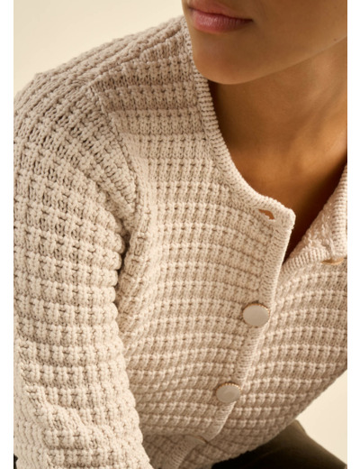 Découvrez le gilet GILARY, une pièce à la fois chic et féminine qui saura captiver votre style. Son col rond et ses manches longues offrent une silhouette élégante, accentuée par des boutons bijoux et des poches plaquées pour une touche de raffinement supplémentaire. Ce gilet polyvalent se marie parfaitement avec votre jean préféré ou par-dessus l'une de nos robes. Disponible en écru, marine et prune, il est confectionné dans un tricot fantaisie en coton mélangé, épousant délicatement votre silhouette. Optez pour le confort et l'élégance avec le gilet GILARY, parfait pour toutes les occasions.