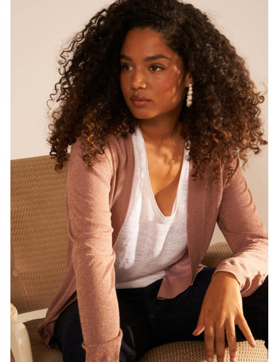 Le gilet mi-long GLADI se distingue par sa maille douce en lurex et ses manches longues. Associez-le à un jean en denim.