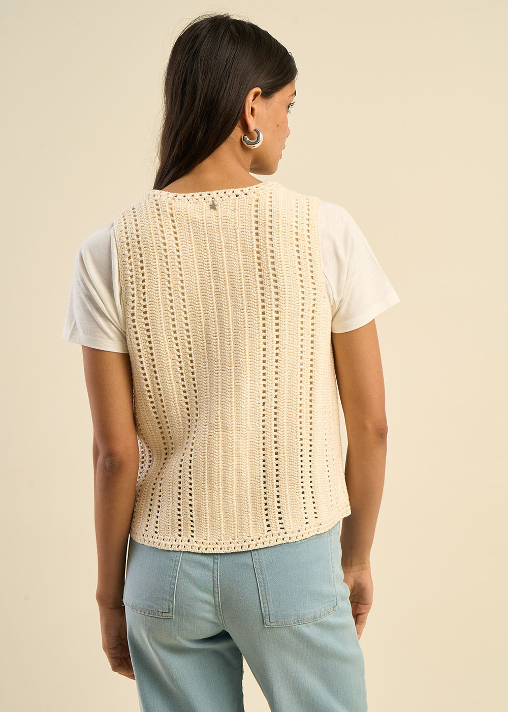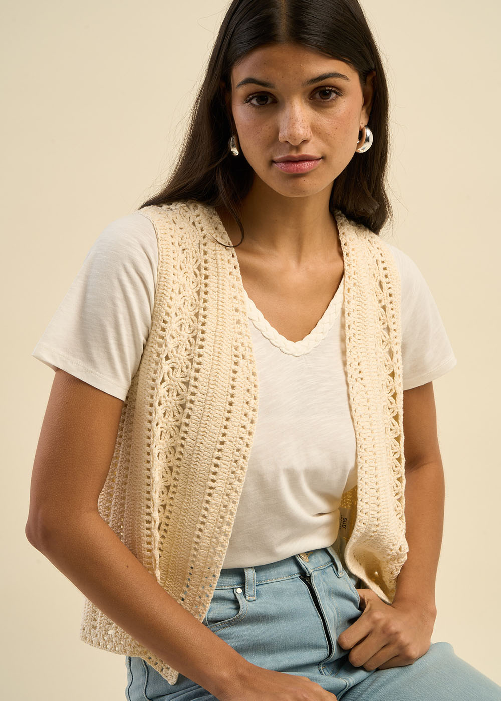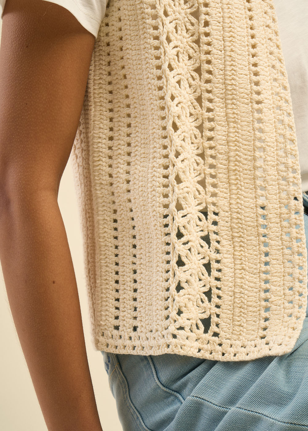 Laissez-vous séduire par notre gilet GARYOU, une pièce sans manches au charme intemporel. Son tricot en maille crochet de moyenne jauge lui apporte une texture authentique et raffinée, idéale pour une allure bohème et élégante.