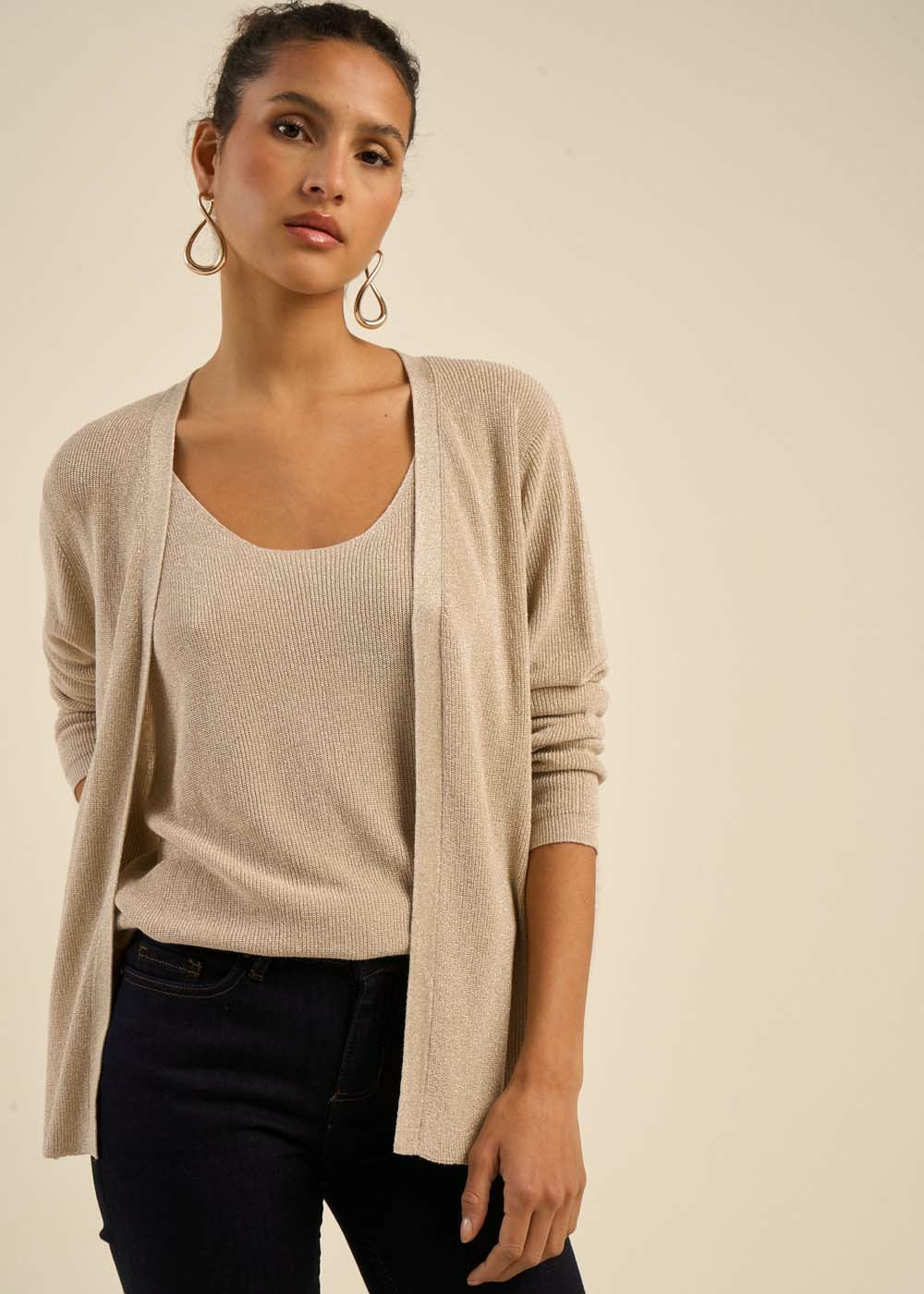 Laissez-vous séduire par notre gilet GALDIS. Confectionné avec des fibres métalliques, il ajoute une touche de brillance subtile à vos tenues tout en offrant confort et élégance. Avec ses manches longues et sa coupe droite, il se porte aisément par-dessus vos vêtements pour un style décontracté et raffiné. La matière douce et fluide assure un porté agréable tout au long de la journée, tout en vous apportant une légère touche de chaleur.