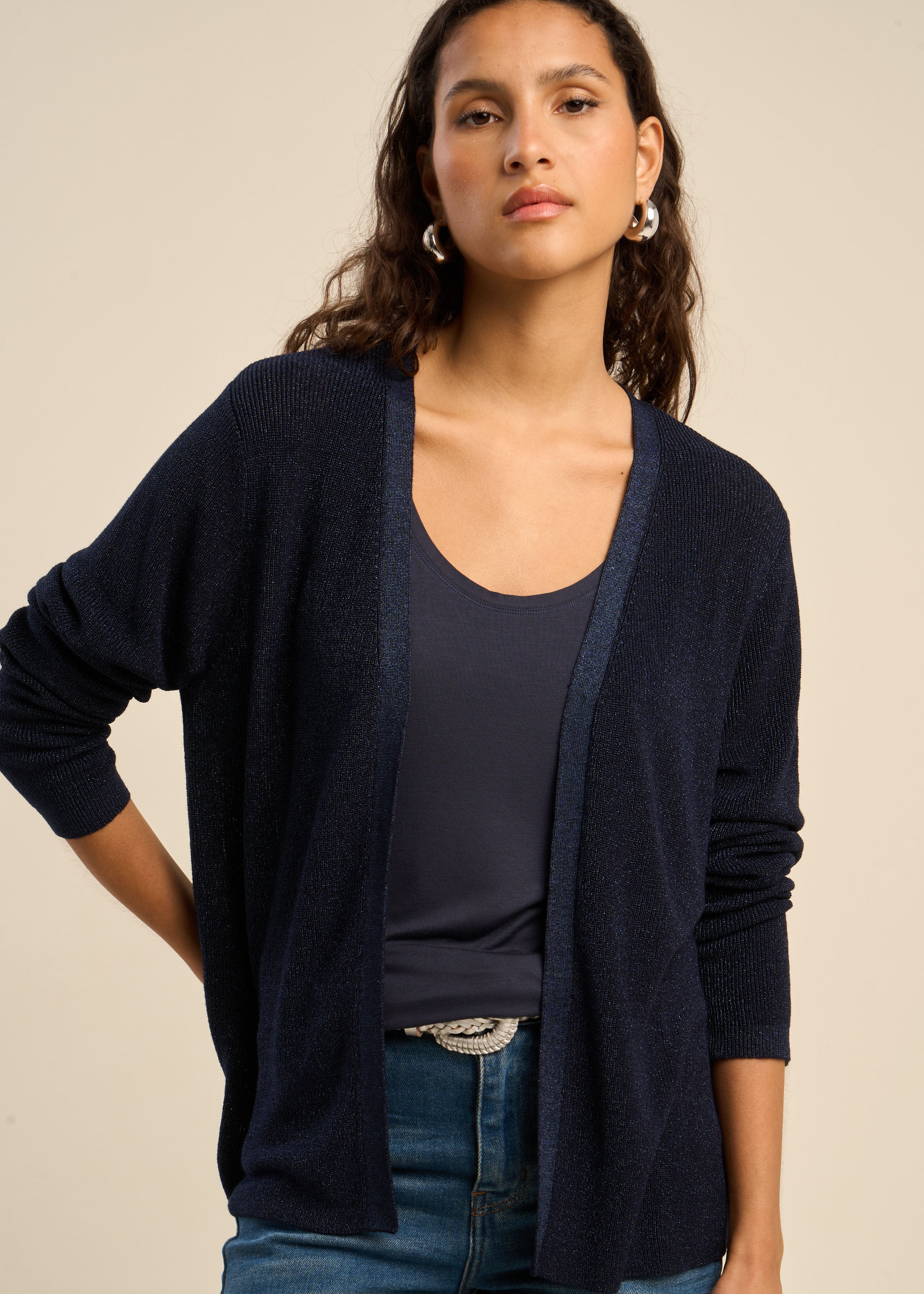 Laissez-vous séduire par notre gilet GALDIS. Confectionné avec des fibres métalliques, il ajoute une touche de brillance subtile à vos tenues tout en offrant confort et élégance. Avec ses manches longues et sa coupe droite, il se porte aisément par-dessus vos vêtements pour un style décontracté et raffiné. La matière douce et fluide assure un porté agréable tout au long de la journée, tout en vous apportant une légère touche de chaleur.