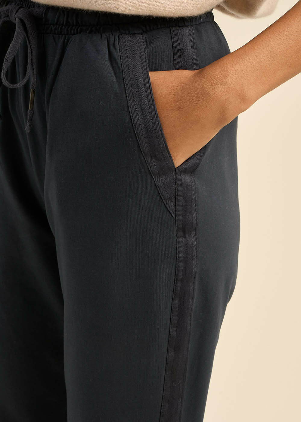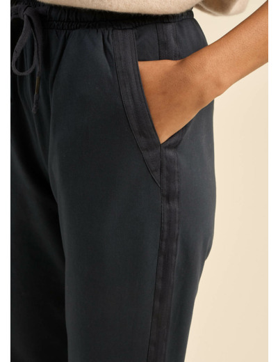Le jogging POERY présente une taille élastiquée avec un cordon de serrage pour un ajustement confortable. Il dispose de poches italiennes à l'avant agrémentées de biais en satin ton sur ton le long de la jambe. Associez-le à un tee-shirt blanc pour créer un ensemble à la fois élégant et décontracté.