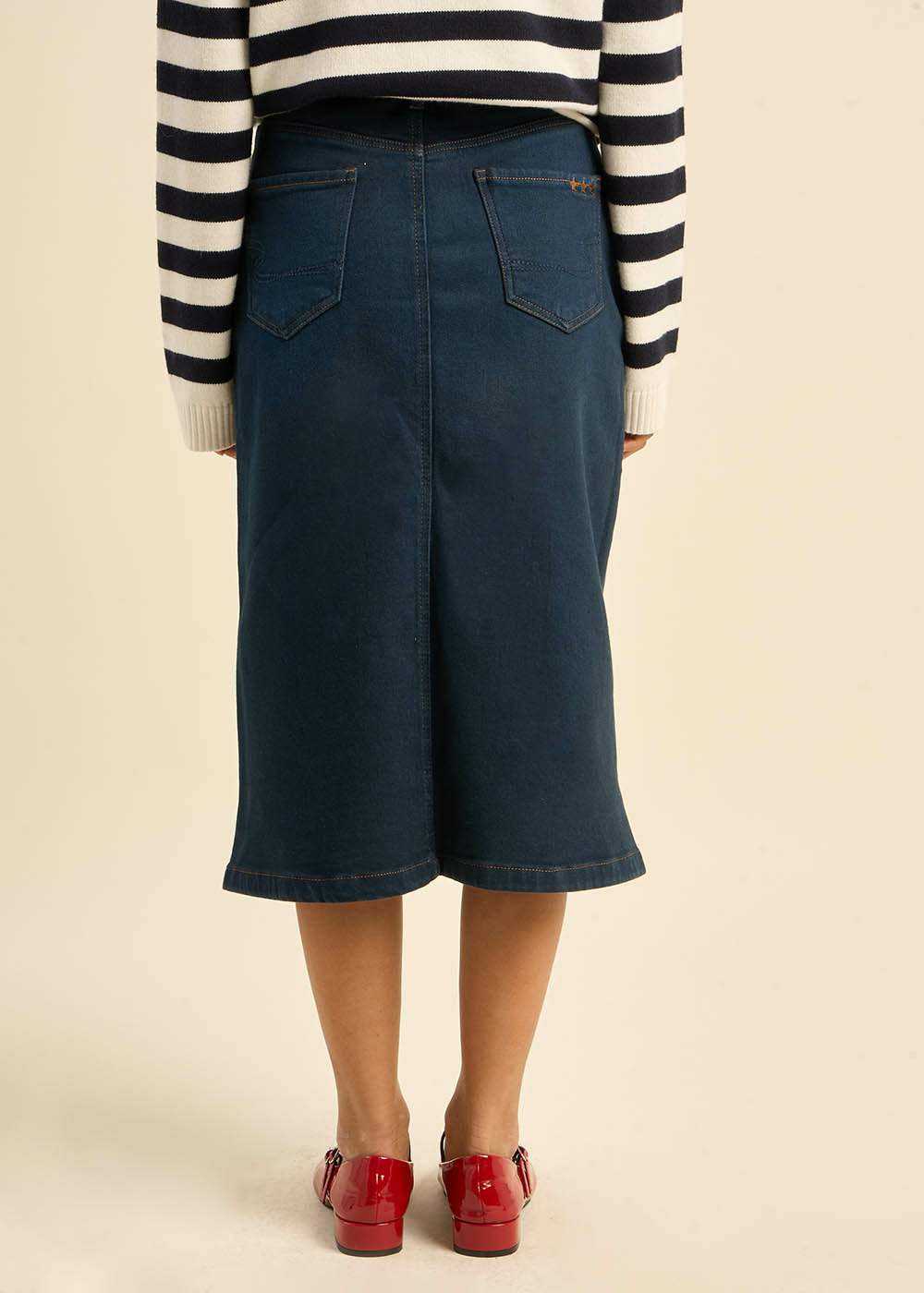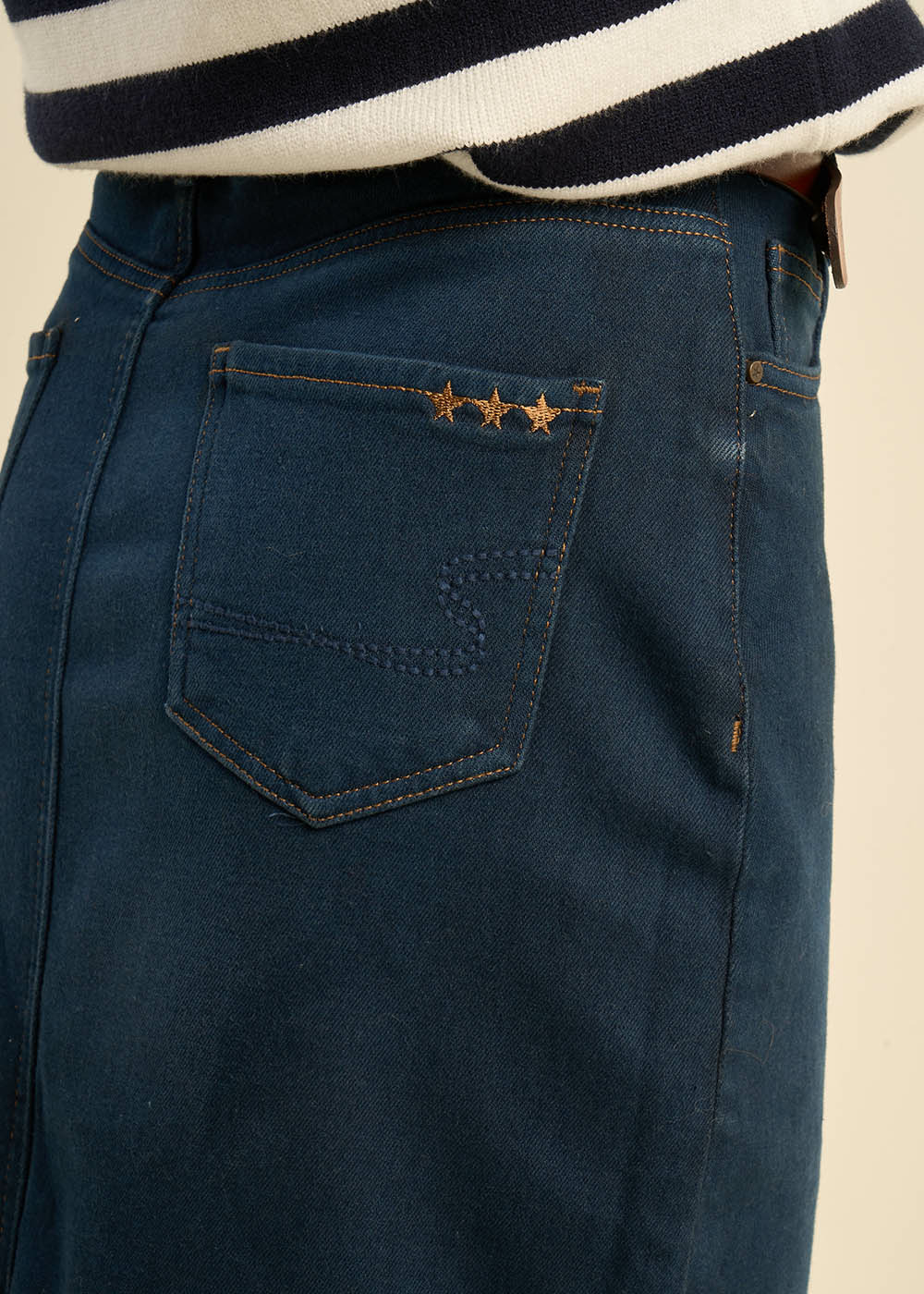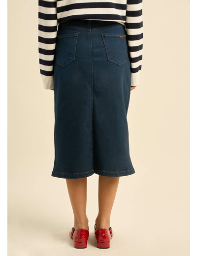La jupe JUSTINE en jean mi-longue combine une coupe élégante avec une fonctionnalité pratique. Elle est dotée d'une fente sur le devant qui ajoute une touche de modernité, ainsi que de cinq poches pour plus de commodité. Ce modèle est parfait pour un look à la fois décontracté et raffiné.