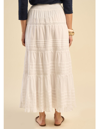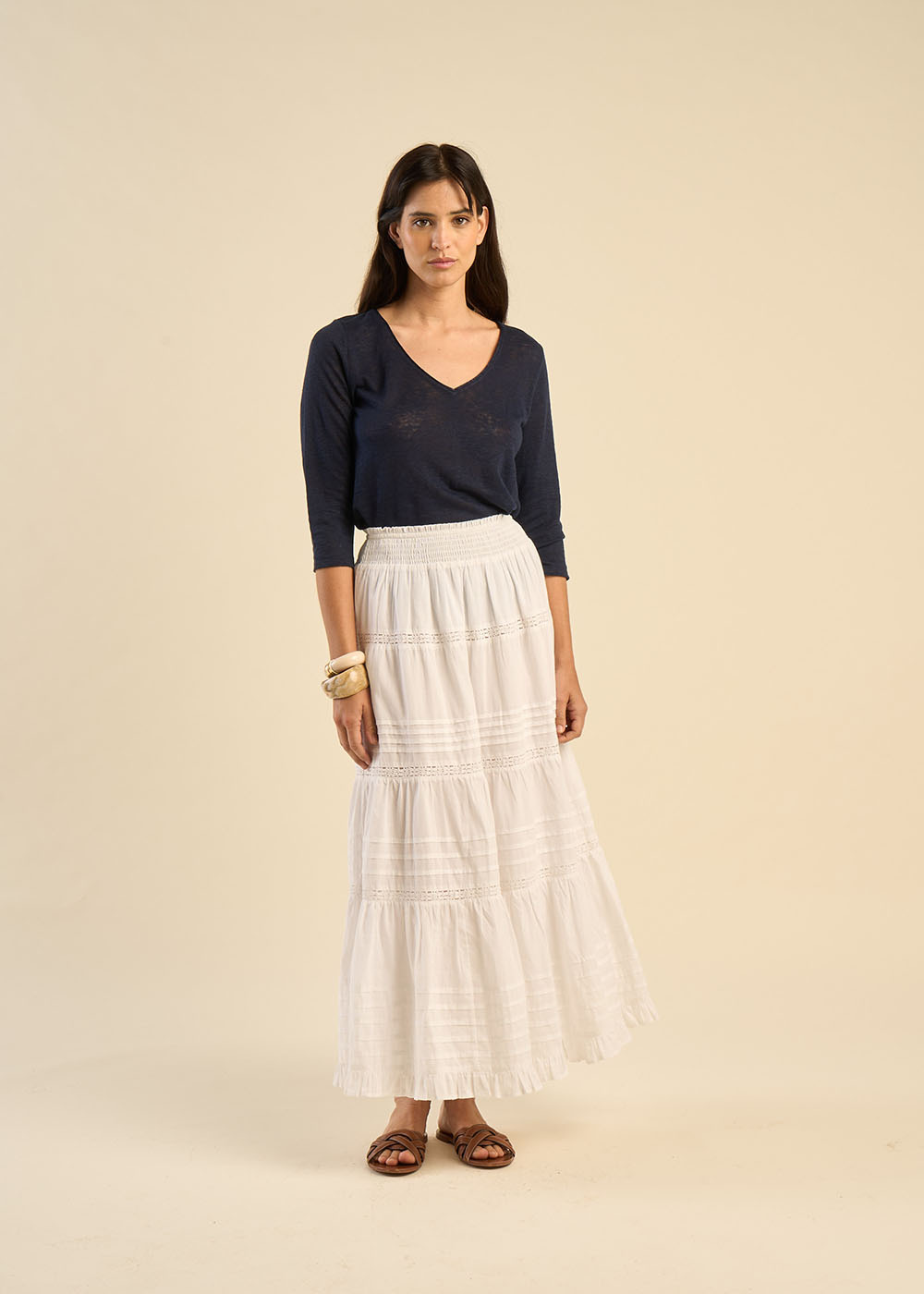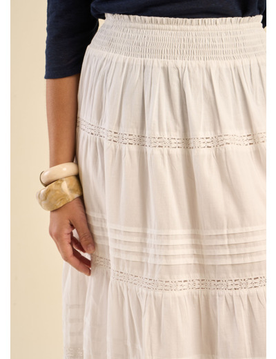 La jupe JOLINIE séduit par son charme bohème et romantique. Avec sa coupe longue évasée et ses volants délicats, elle apporte une fluidité et une légèreté idéales pour un look féminin. Les bandes de dentelle incrustées ajoutent une touche raffinée et élégante, tandis que la taille élastiquée assure un confort optimal.