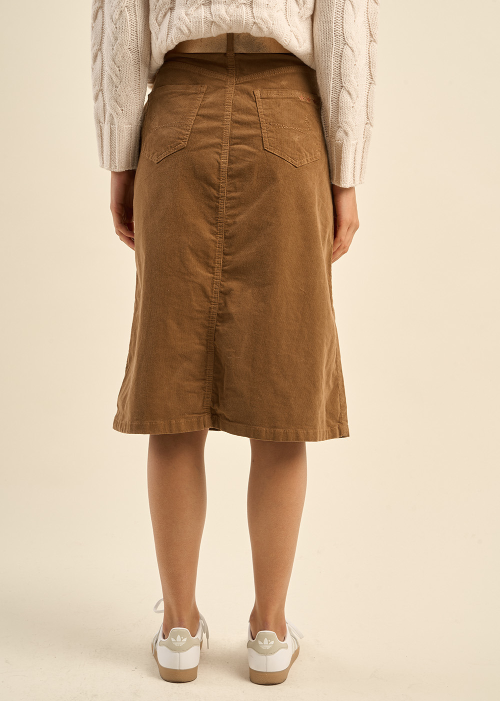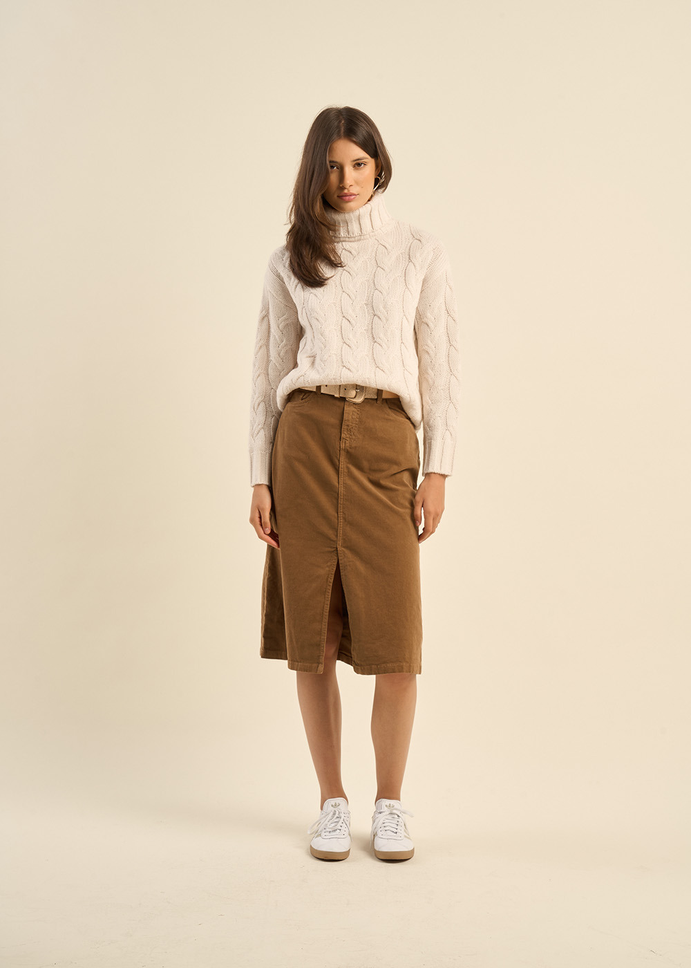 Embrassez l'esprit bohème avec la jupe longue JOY. Sa coupe fluide et ses cinq poches lui confèrent un charme indéniable. Le velours, matière noble et chaleureuse, enveloppe votre silhouette avec délicatesse. En camel ou en kaki, elle s'associe à merveille avec un pull en cachemire et des bottes pour un look bohème chic.