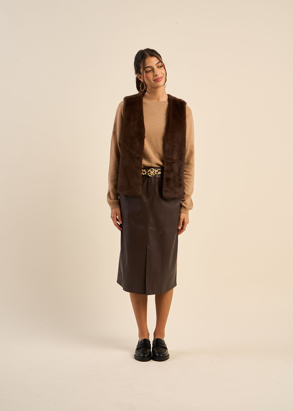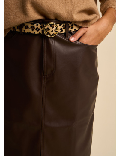 La jupe JULINE, un jeu de contrastes. Sa coupe mi-longue, associée au faux cuir, lui confère une allure rock chic. Les découpes devant et dos, soulignées par des surpiqûres audacieuses, apportent une touche d'originalité. Disponible en noir intemporel ou en chocolat plus doux, elle s'adapte à toutes les personnalités.
