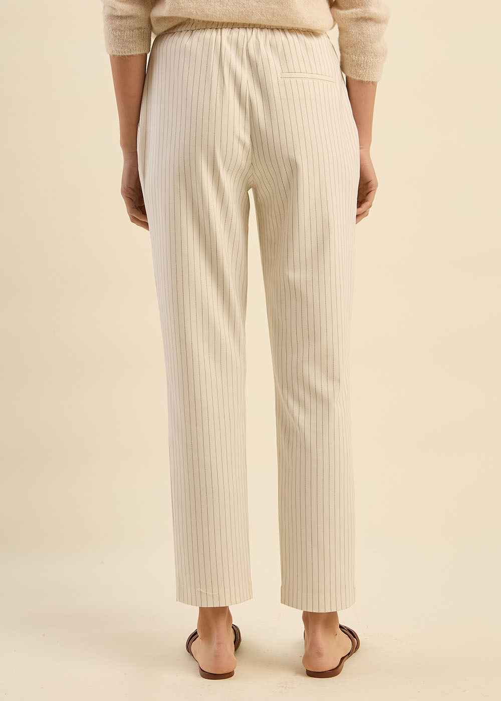Le pantalon PLESOL allie confort et élégance avec sa taille élastique dotée d’un cordon ajustable. Confectionné dans un tissu fluide, il offre une coupe droite qui épouse parfaitement la silhouette tout en restant agréable à porter. Ses poches italiennes ajoutent une touche pratique et chic. Le fond écru à fines rayures marron apporte une note subtile et raffinée à ce pantalon, idéal pour un look élégant et intemporel. Facile à associer avec une blouse ou un top, il vous accompagne aussi bien au quotidien qu'en soirée.