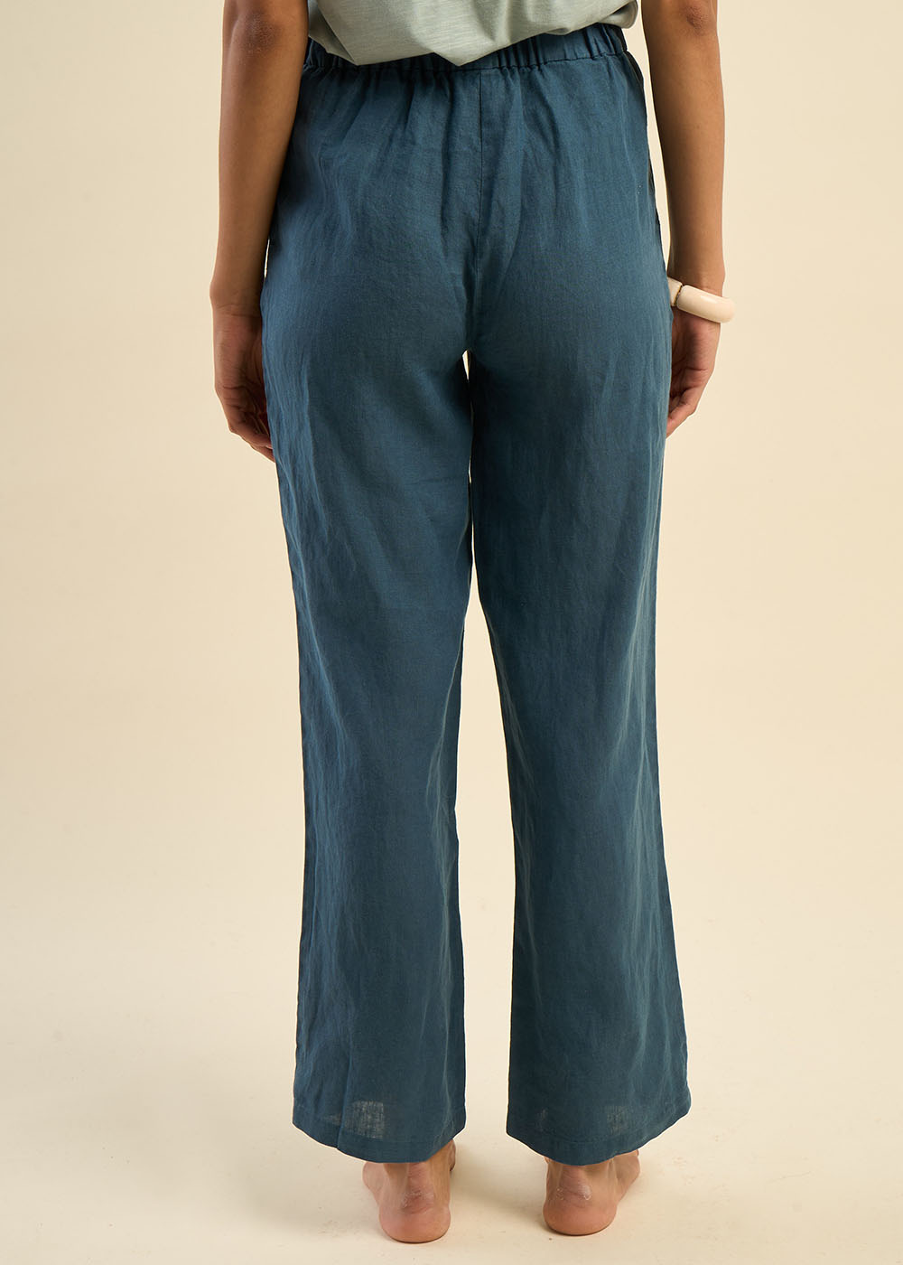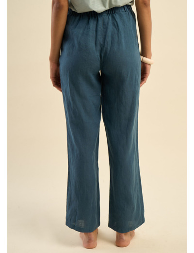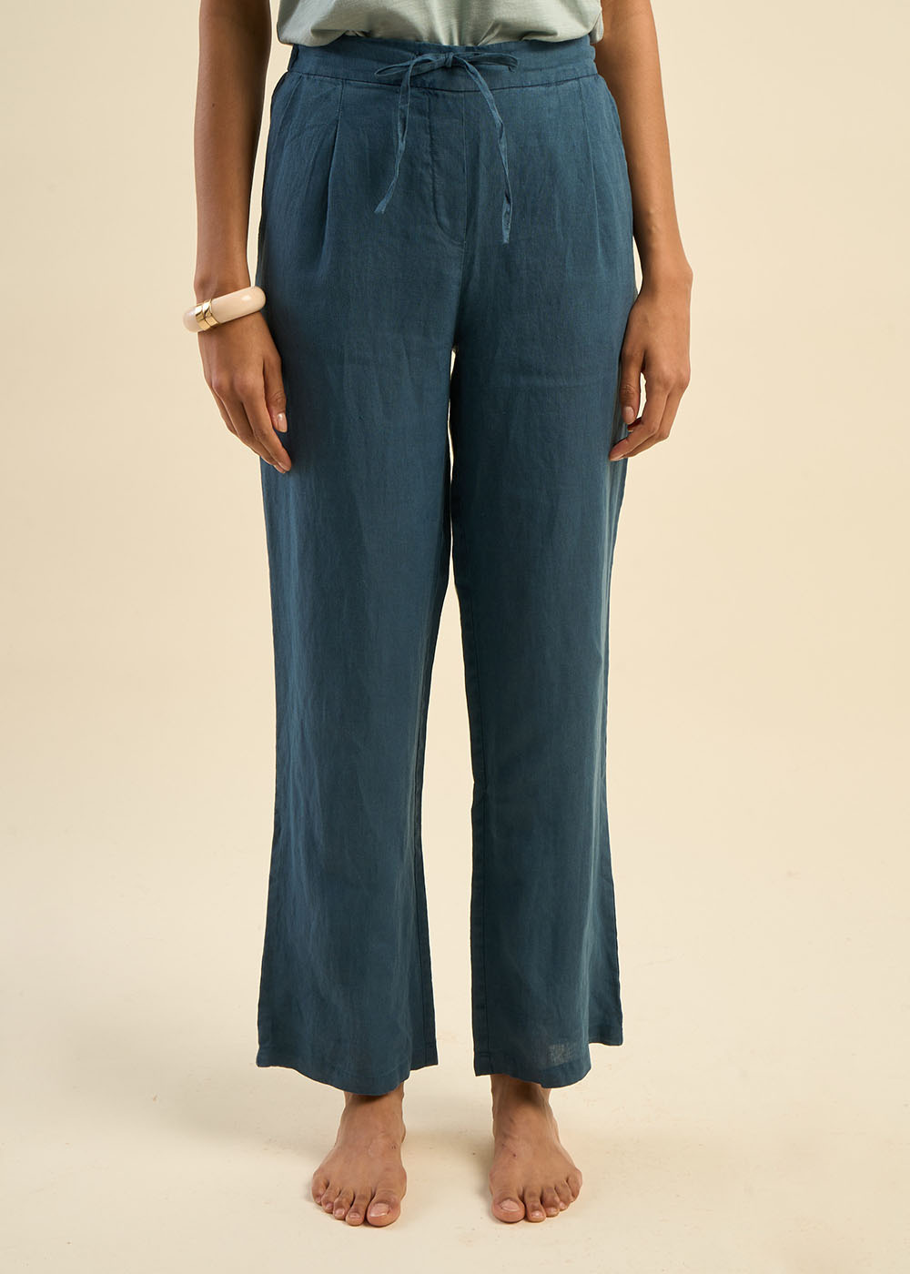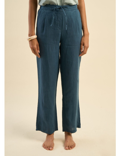 Le pantalon PASKY en lin se caractérise par une taille haute élastiquée avec un lien de serrage offrant un ajustement confortable. Sa coupe présente des jambes larges qui s'évasent davantage vers l'ourlet créant une silhouette distinctive inspirée des styles de tailleurs vintage. Les poches italiennes à l'avant ajoutent une touche pratique et élégante à ce pantalon.