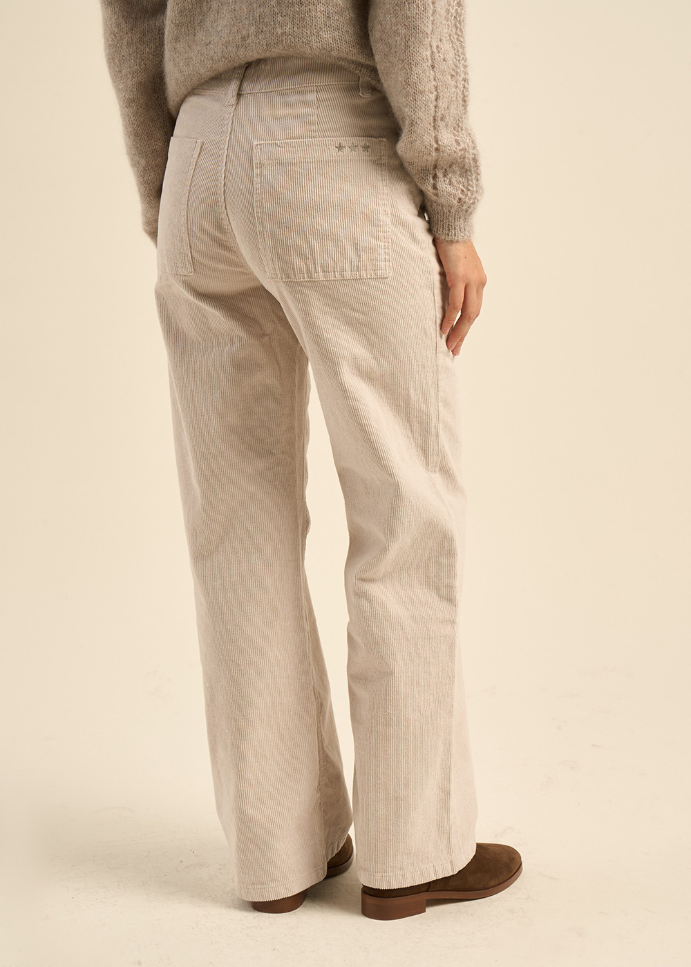 Le pantalon PALOMA, une réinterprétation moderne du pantalon en velours. Sa coupe droite et large, associée à la texture du velours côtelé 11 raies, lui confère un charme intemporel. La taille haute souligne la silhouette et les poches plaquées apportent une touche pratique.