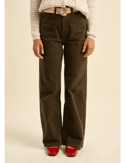 Le pantalon PALOMA, une réinterprétation moderne du pantalon en velours. Sa coupe droite et large, associée à la texture du velours côtelé 11 raies, lui confère un charme intemporel. La taille haute souligne la silhouette et les poches plaquées apportent une touche pratique.